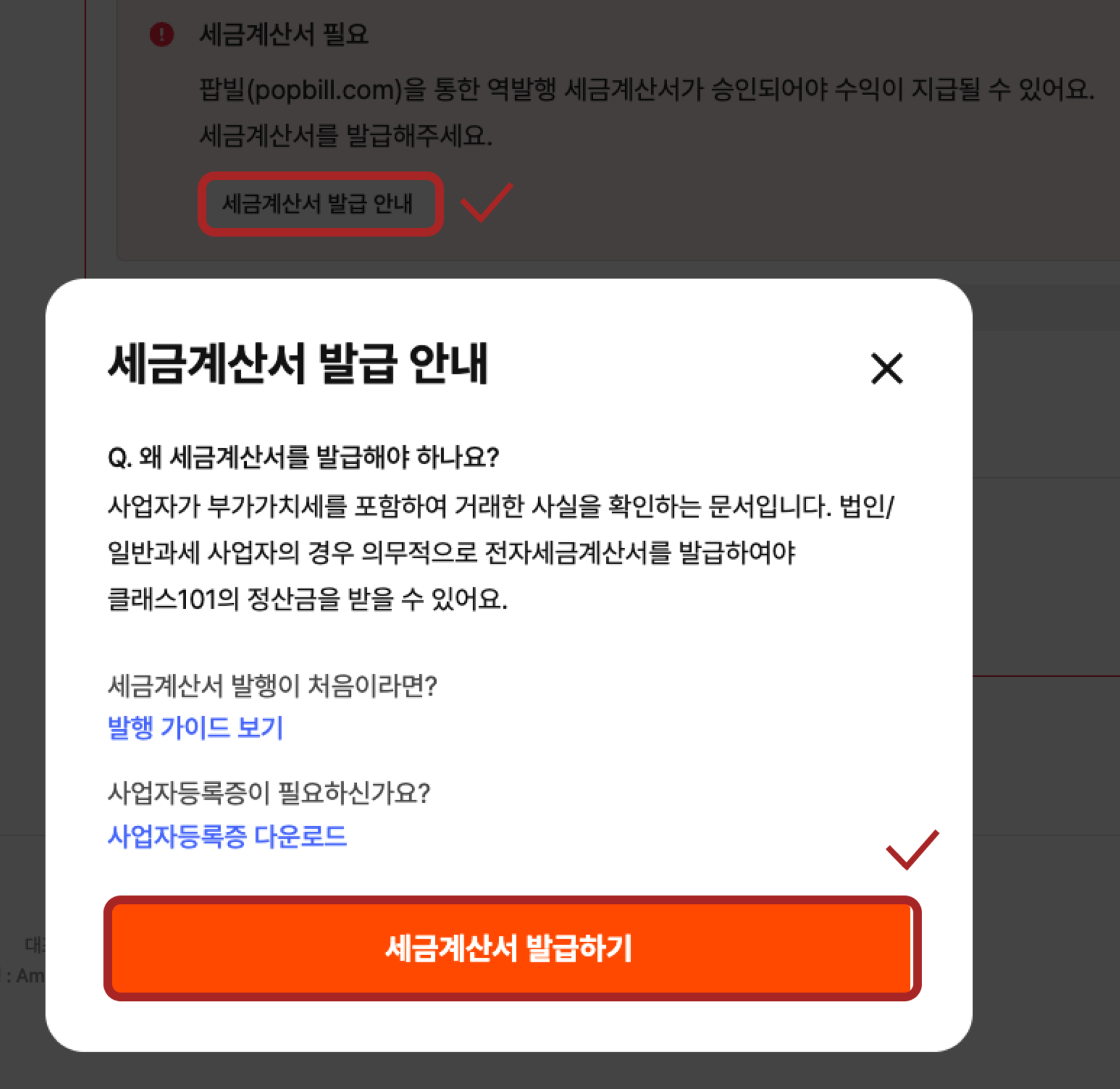 팝업창에서 [세금 계산서 발행하기] 버튼을 눌러 팝빌 사이트로 이동합니다.