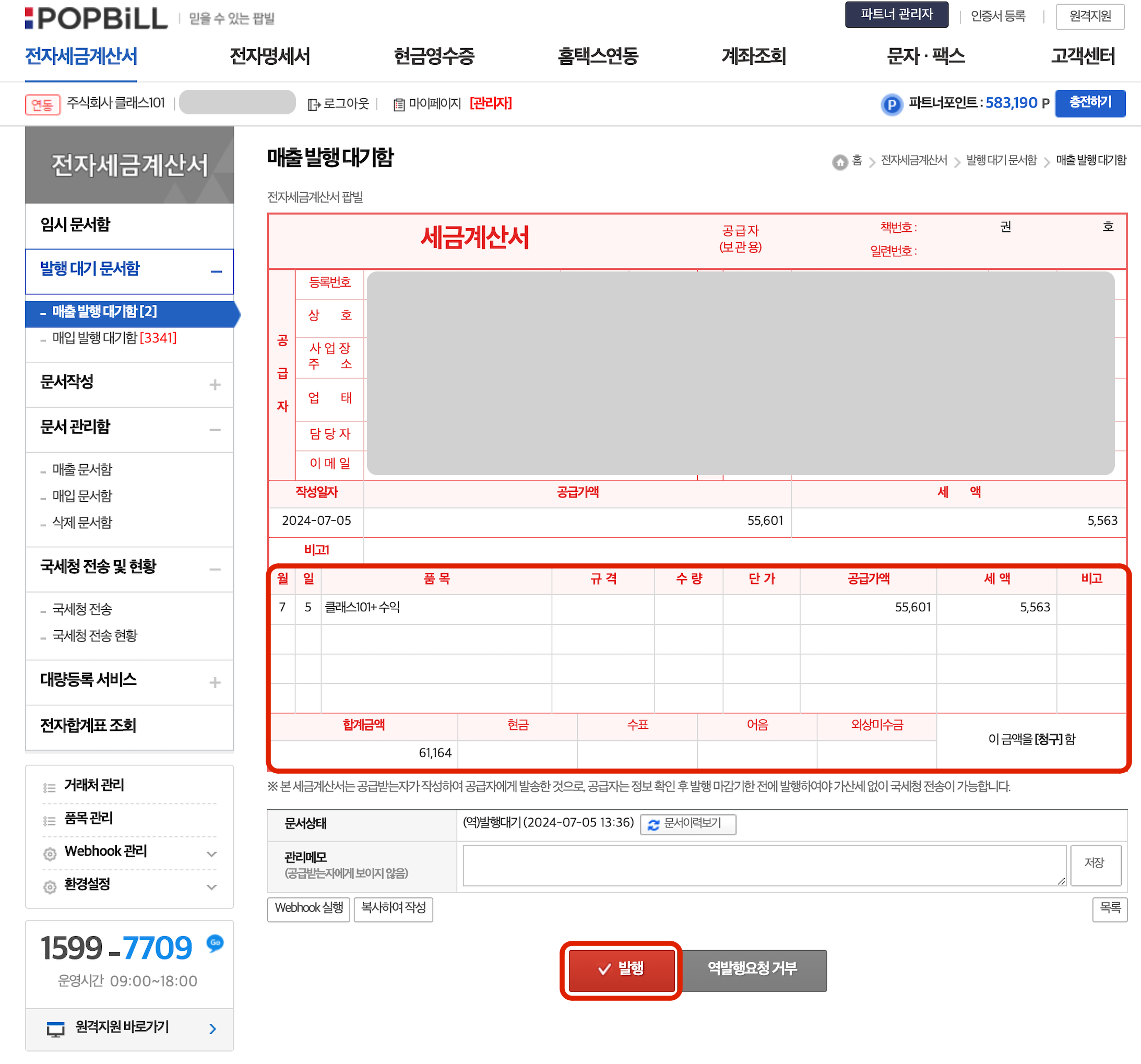 정산서 우측 하단에 있는 [세금 계산서 발행하기] 버튼을 클릭하면 팝빌 사이트로 이동합니다.