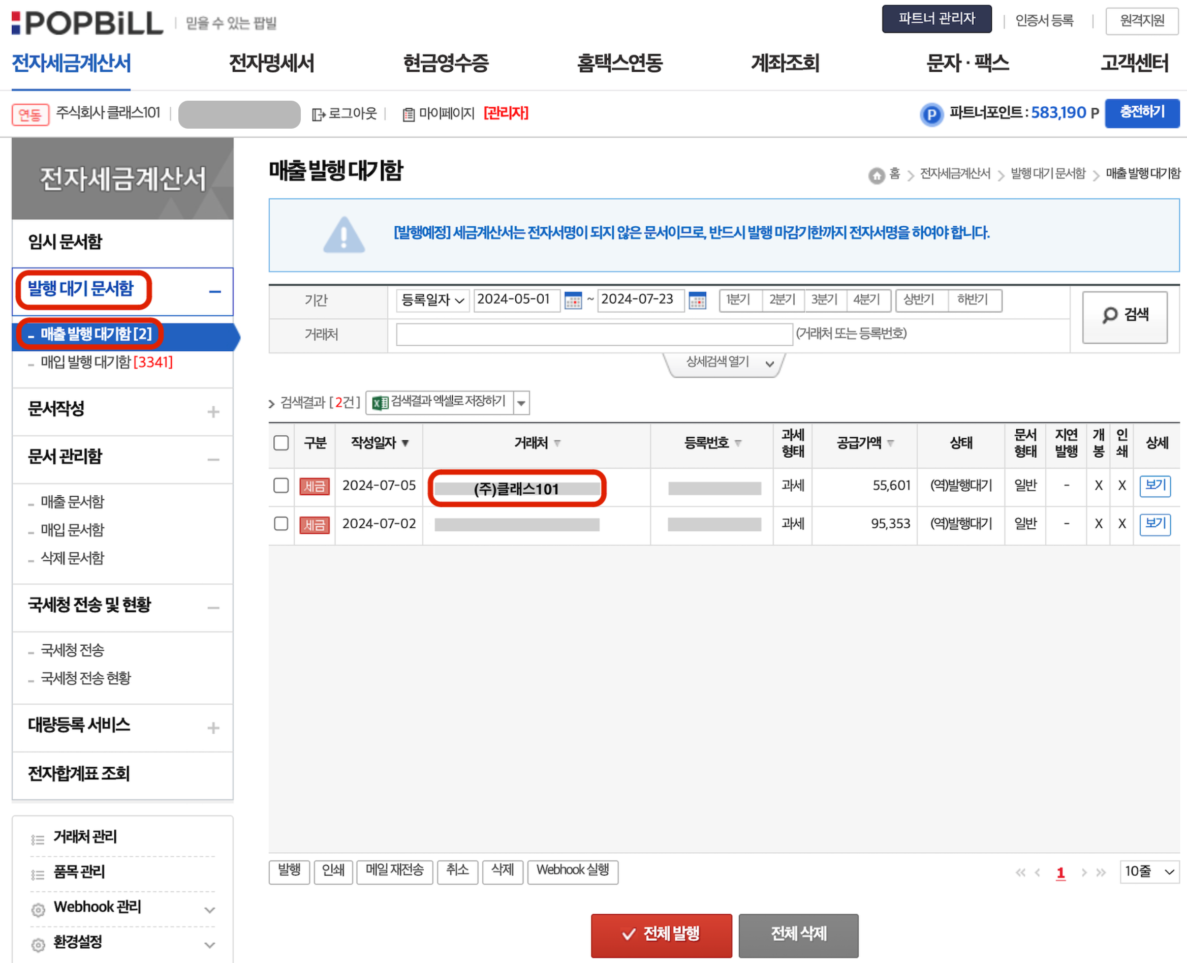 팝빌 로그인 후 상단 메뉴에서 [조회/발급] → [발행 대기 문서함] → [매출 발행 대기함]으로 이동합니다.