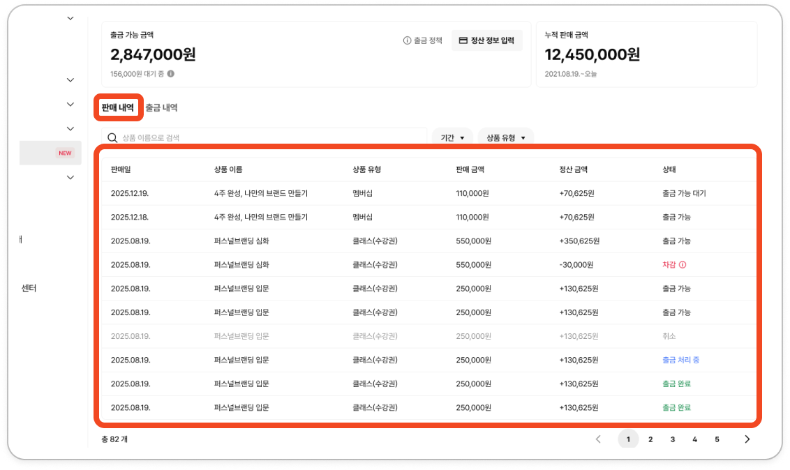 상품 이름과 기간, 상품 유형 및 정산 상태로 원하는 조건의 판매 내역을 조회하실 수 있습니다.