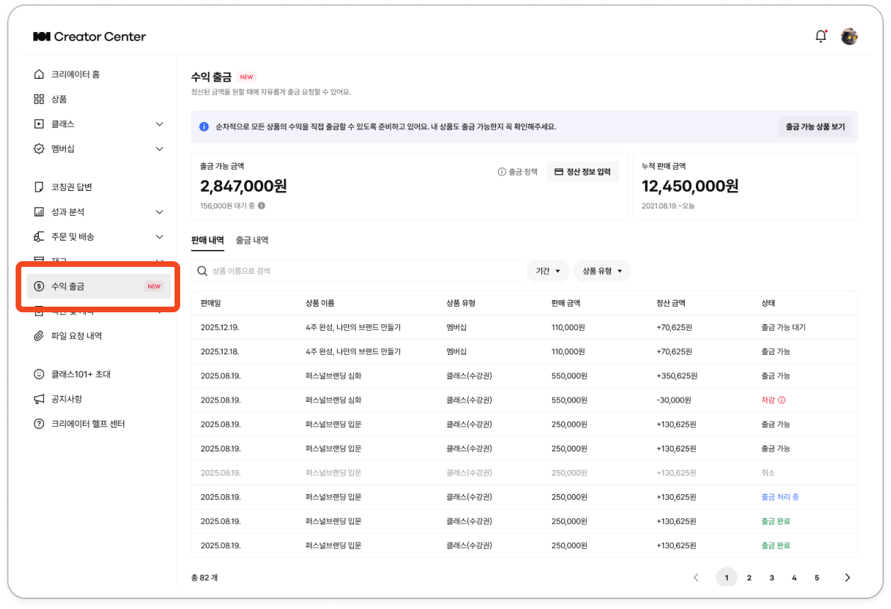 크리에이터 님이 운영 중인 다양한 상품의 판매 후 정산금을 한 곳에 모아서 볼 수 있고, 크리에이터님이 원하는 시점에 직접, 원하는 정산 정보로 출금 요청할 수 있는 기능입니다.