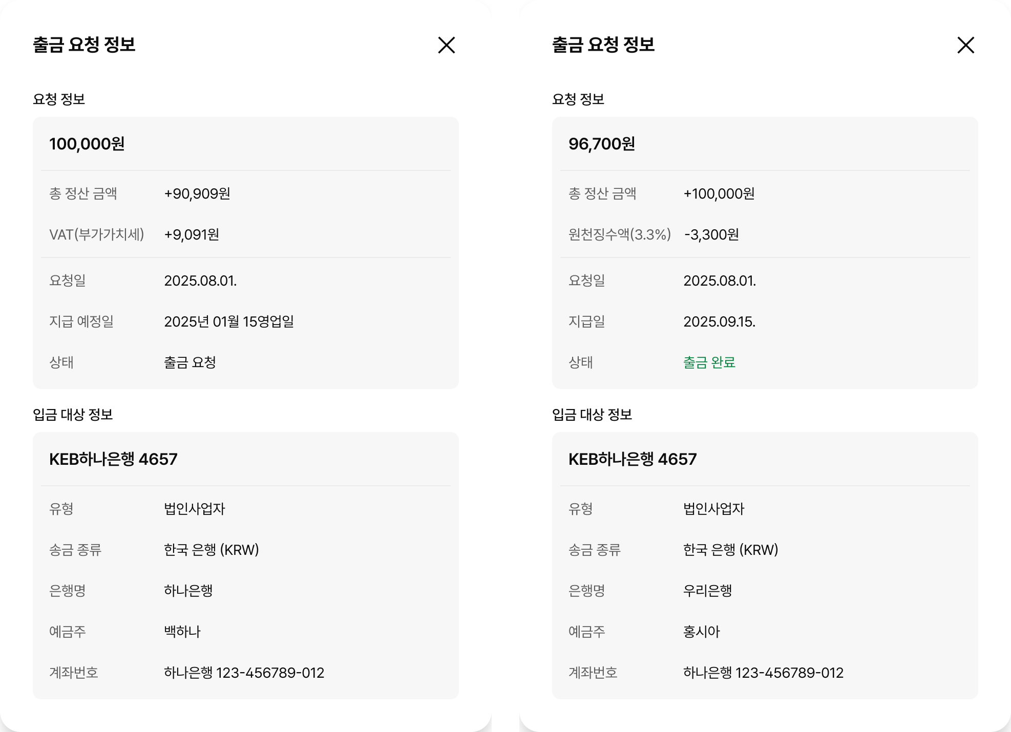 출금 예정 금액 | 출금 신청 금액에서 세금(사업자/개인 여부에 따른 원천징수 등) 및 송금 수수료를 제외하고 실제 통장에 찍히는 최종 금액입니다. |