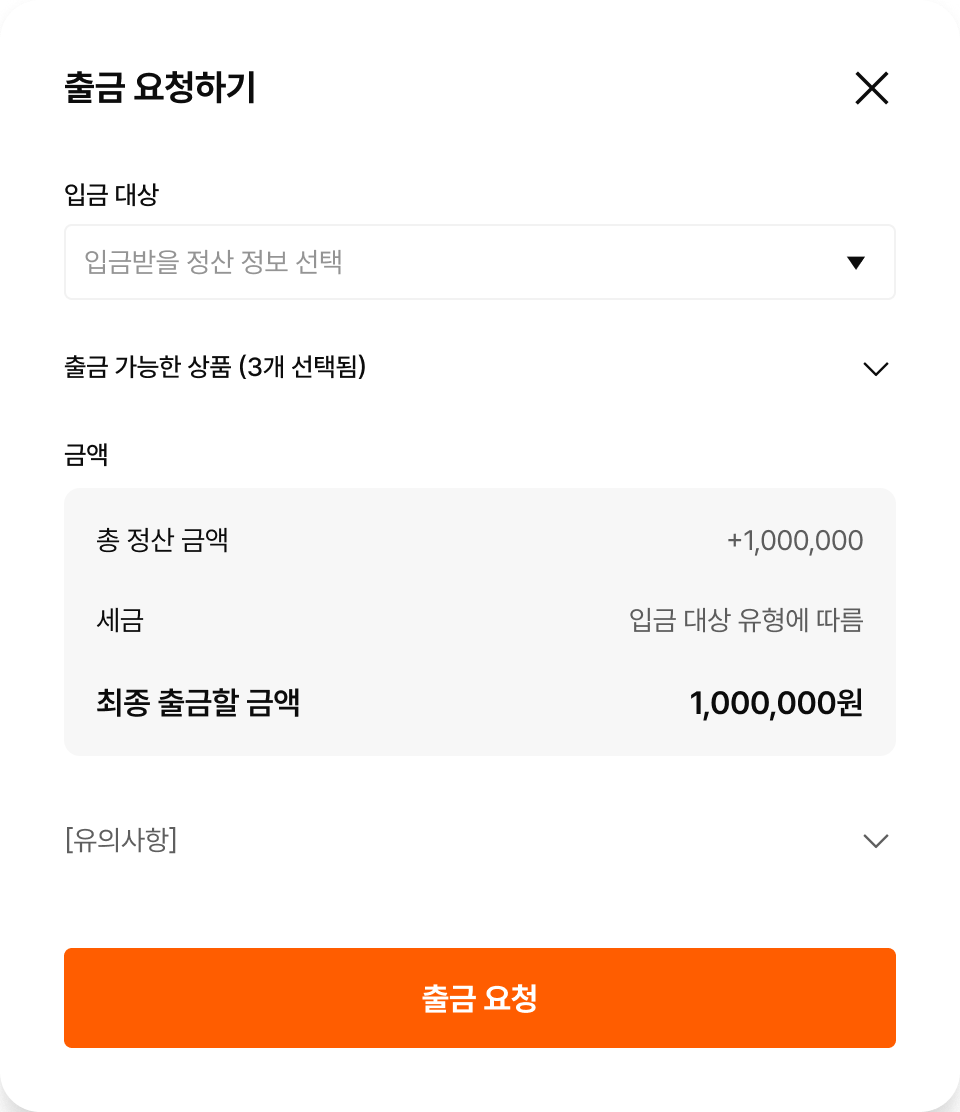 수익 출금에 포함된 모든 상품의 ‘출금 가능 금액’이 ‘최소 출금 가능 금액’만 넘으면 출금 요청을 할 수 있어요