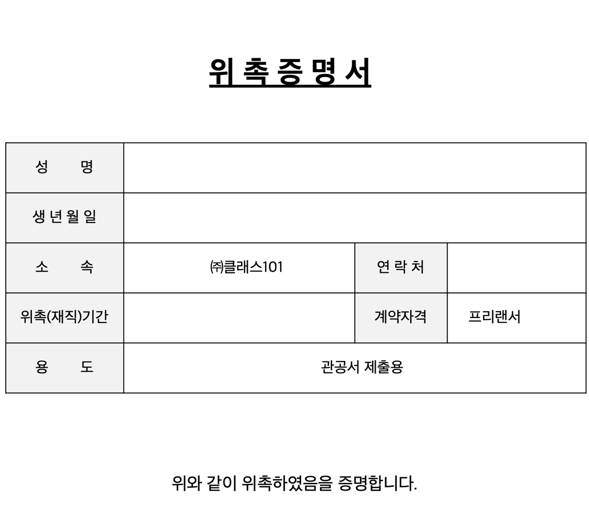 작성 후 전달주시면, 예시와 같은 형식에 발급일과 클래스101 대표 직인이 포함된 위촉증명서의 발급이 가능합니다.
