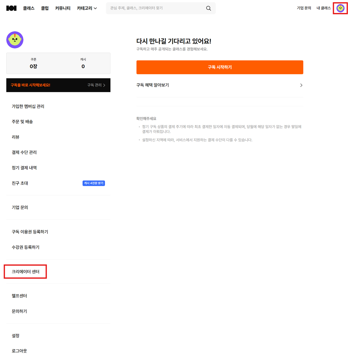 클래스101 홈페이지 → 로그인 → 내 프로필 → [크리에이터 센터] 아이콘 클릭
