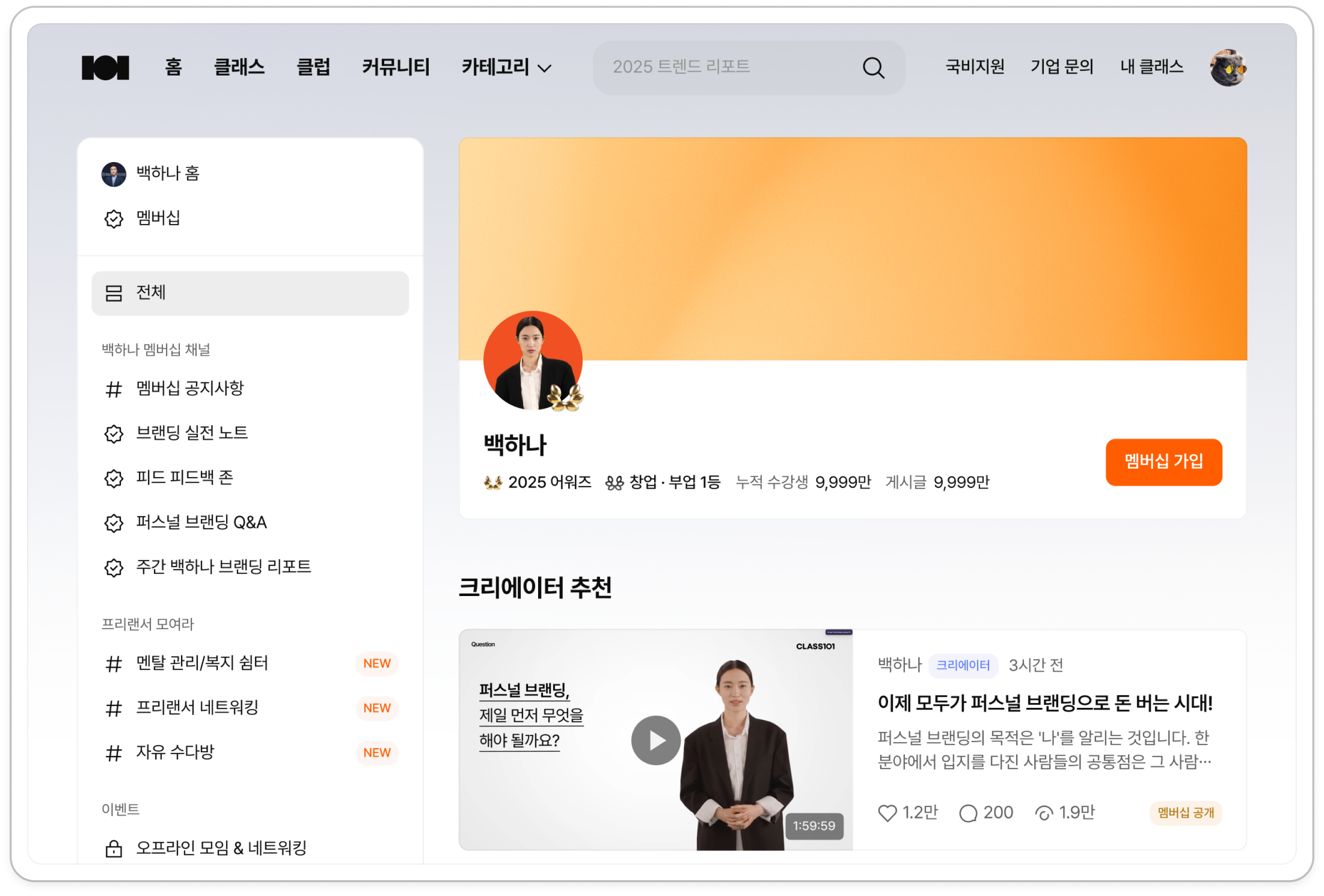구독 클래스 | 대표 크리에이터가 운영하고 있는 구독(SVOD) 클래스 상품이 자동 노출됩니다. | 1 |