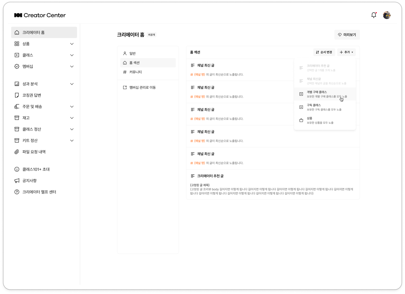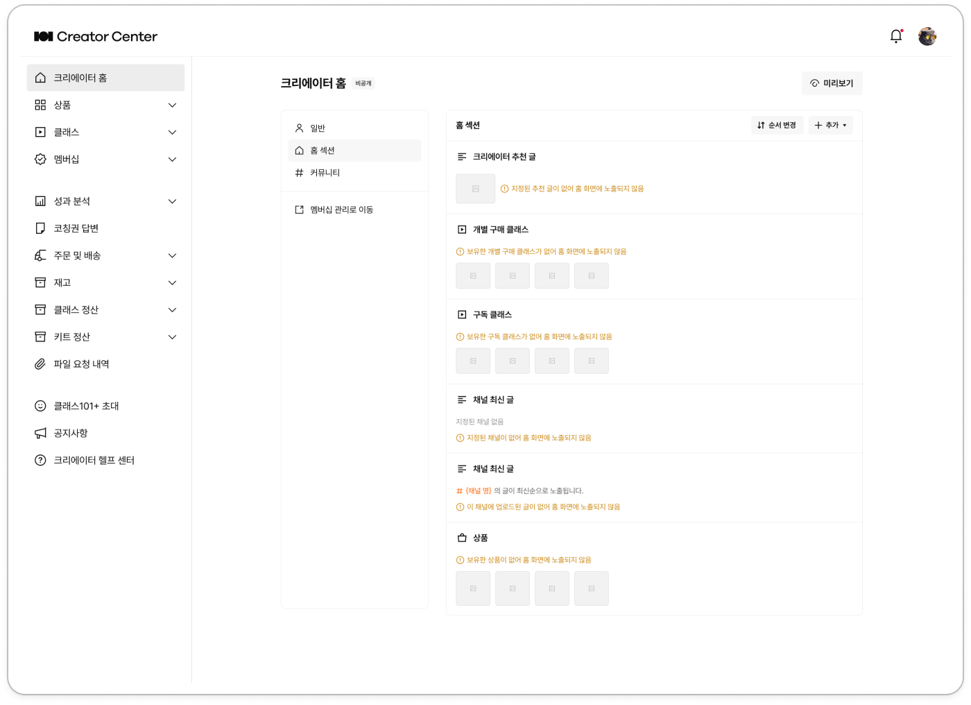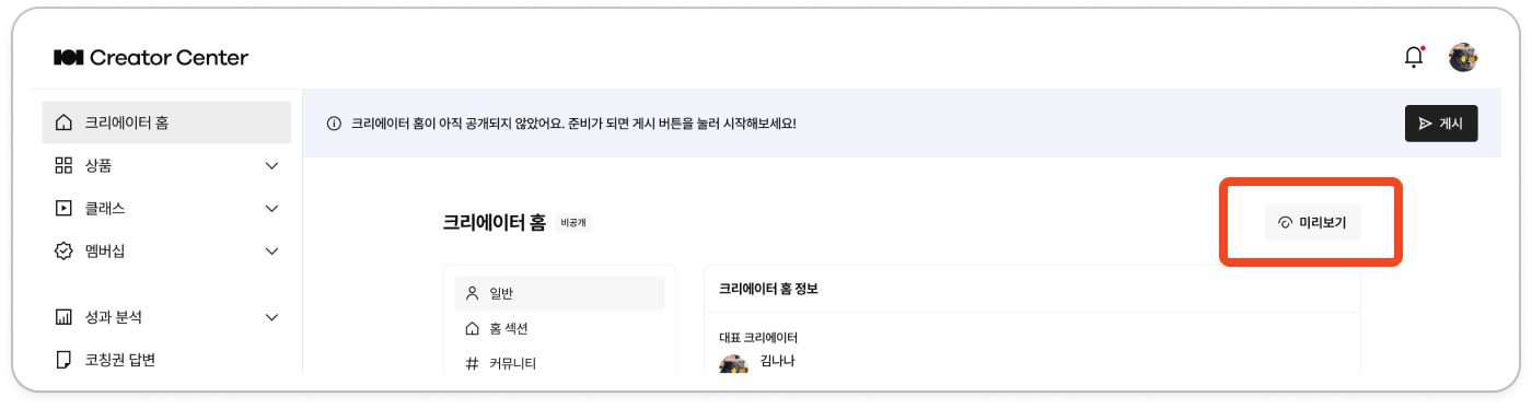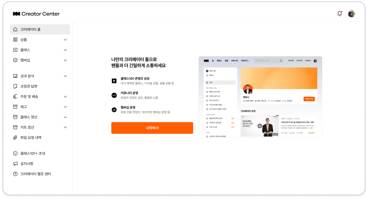 '크리에이터 홈'은 크리에이터님의 모든 클래스와 상품을 한 눈에 둘러볼 수 있고, 전용 커뮤니티를 통해 클래스메이트와 소통할 수 있는 공간입니다.