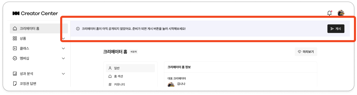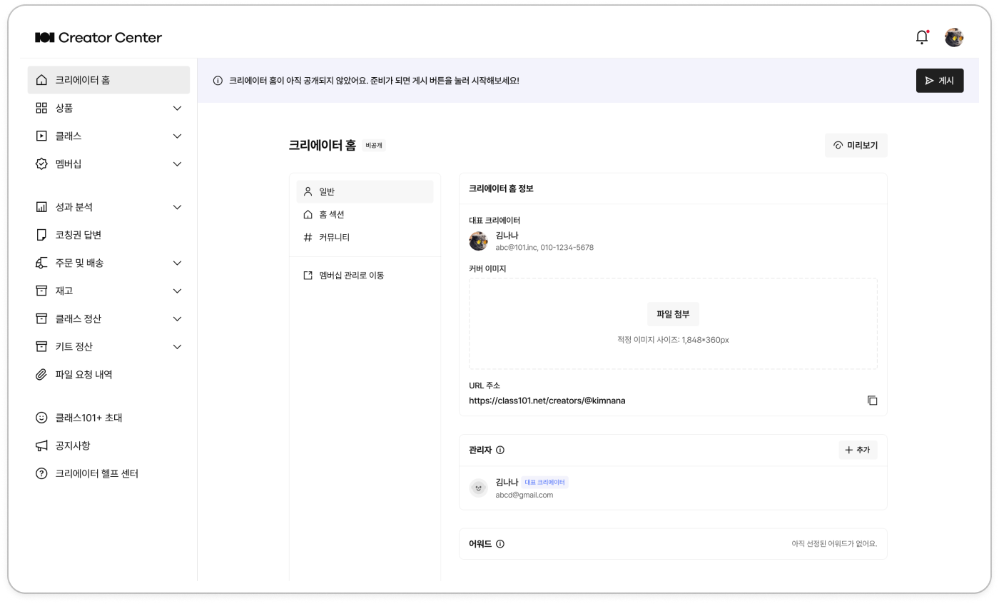 아직 크리에이터 홈이 ‘공개’되지 않았어요. 아래 가이드에 맞춰 기본 세팅을 마치고 상단 띠배너 내 ‘게시’를 클릭해야 크리에이터 홈이 클래스메이트에게 공개되어요.
