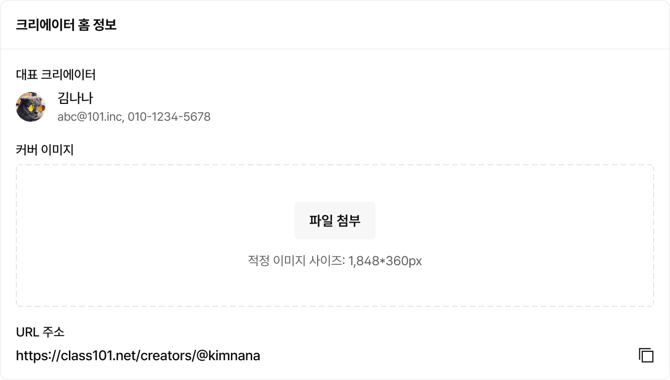 [일반] 탭에서는 ‘크리에이터 홈’의 기본 정보를 확인하고 설정할 수 있습니다.