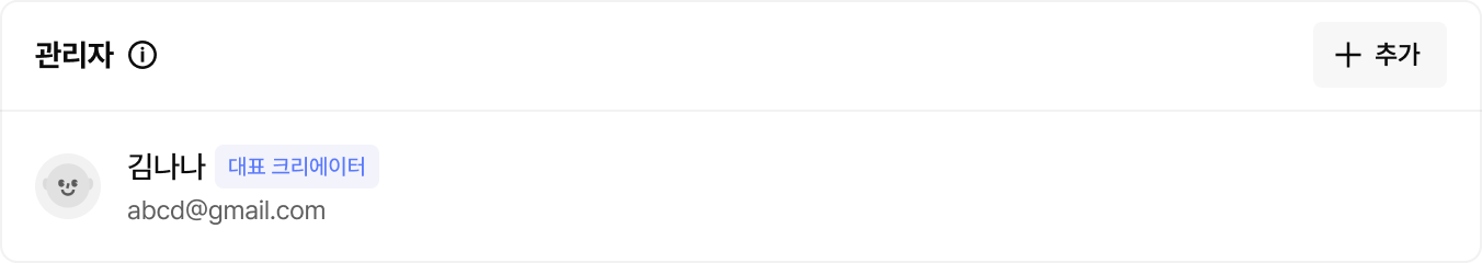 ‘관리자’ 섹션에서 ‘+추가’ 버튼을 클릭하여, 함께 크리에이터 홈과 커뮤니티를 관리할 수 있는 ‘매니저’를 추가할 수 있어요