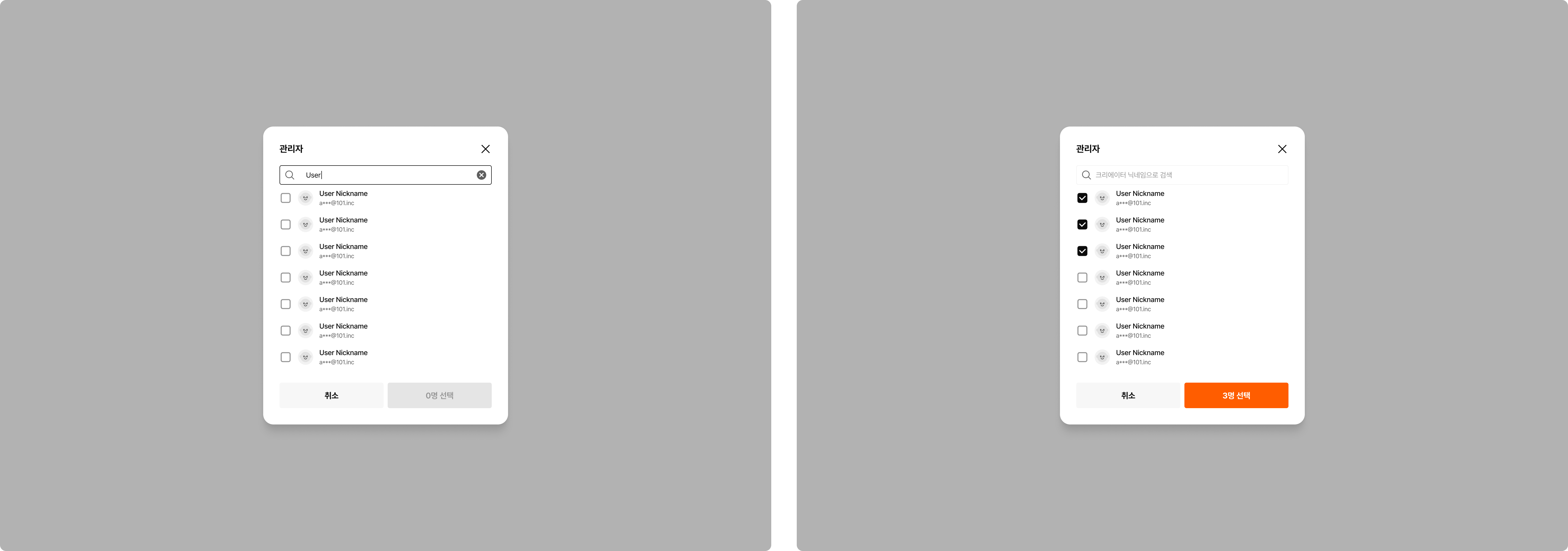 대상 유저를 선택하고, ‘N명 선택’ 버튼을 클릭하면 관리자 추가가 완료됩니다.