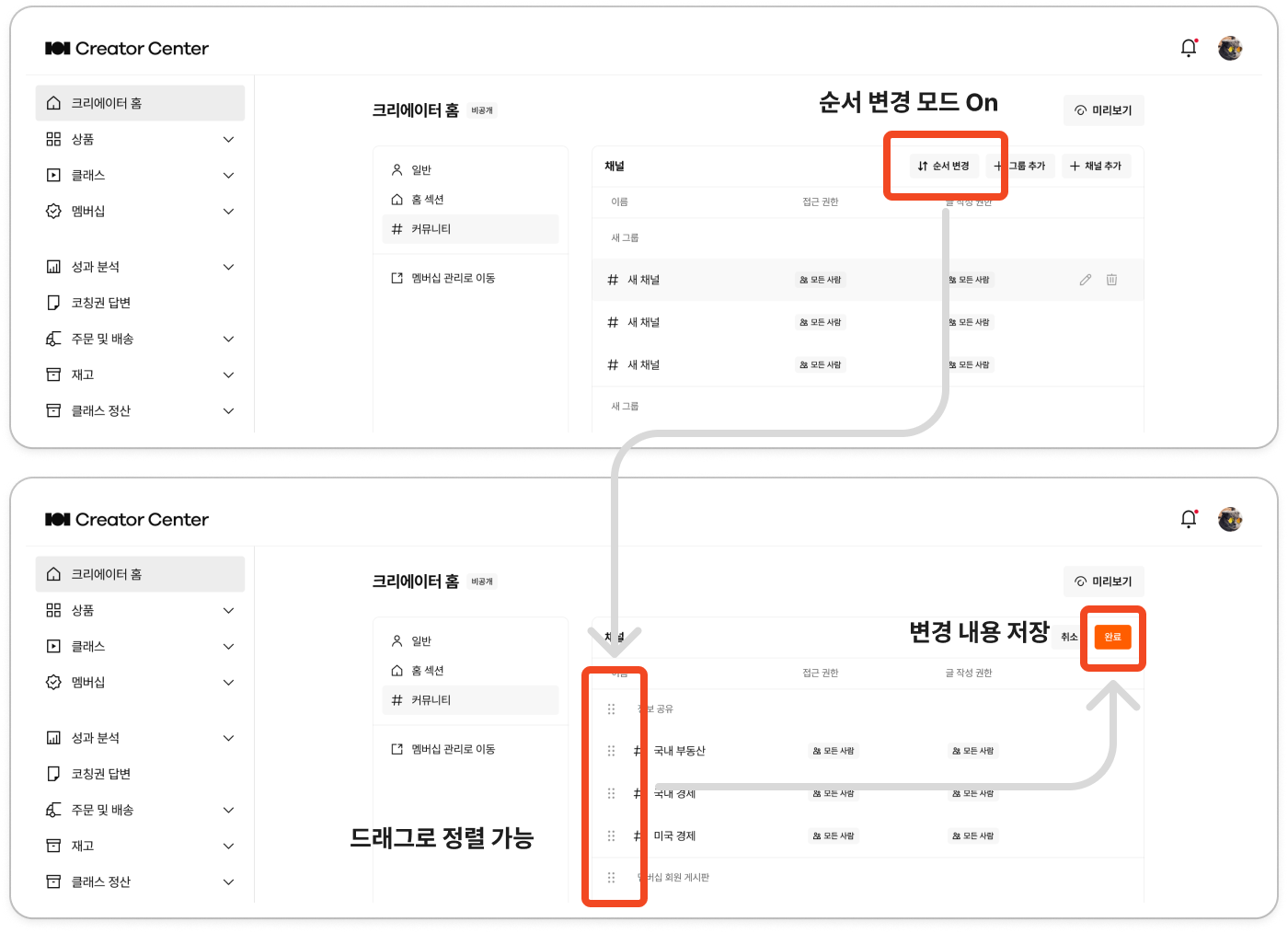 ‘순서 변경’ 버튼을 눌러, 채널 및 그룹 순서를 변경할 수 있습니다