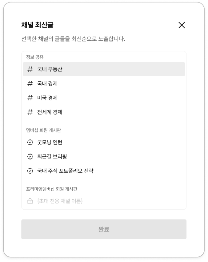 초대 받은 사람 | 프라이빗 채널로 설정되며, ‘초대 받은’ 유저만 게시물을 조회할 수 있습니다. *초대 받지 않은 유저는 ‘채널 게시판’에도 접근할 수 없습니다. | |