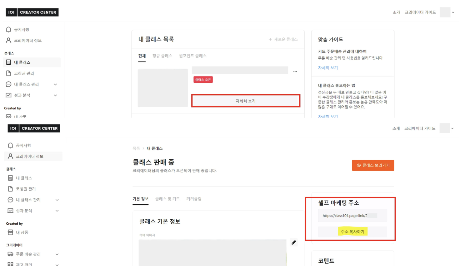 셀프마케팅 링크 확인 방법: [크리에이터센터 > 내클래스 > 자세히보기 > 셀프마케팅 주소 복사하기]