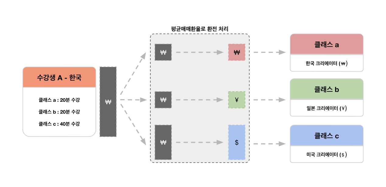 이에 따라, 글로벌 유저의 결제 금액은 각 크리에이터의 정산 정보 기준으로 환전되어 지급됩니다.