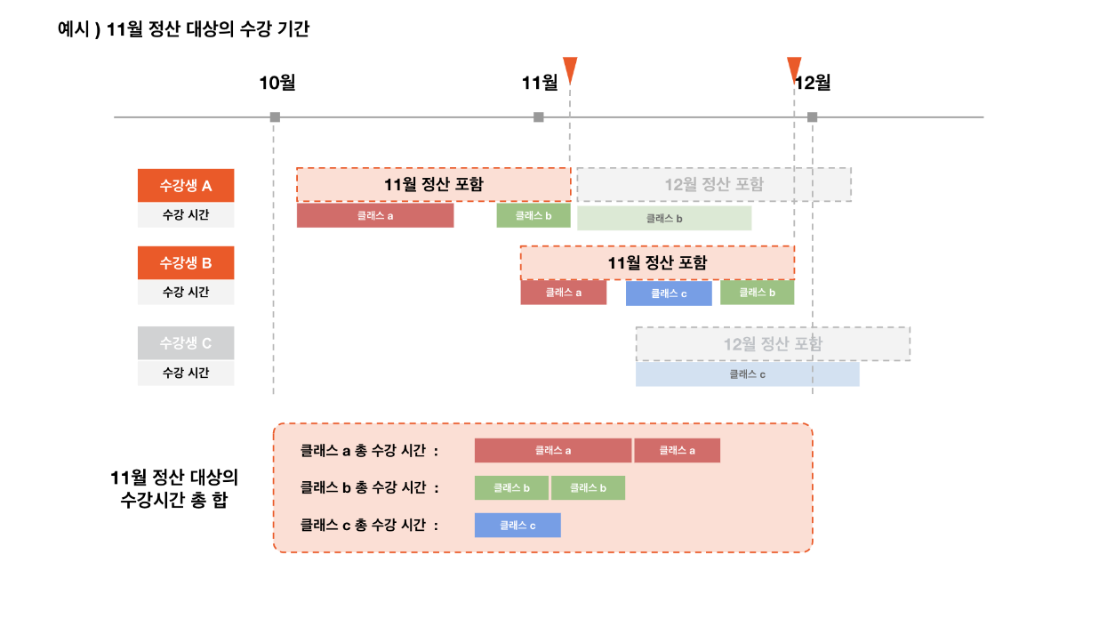 정산은 해당 월에 정산 대상이 된 구독권들의 수강 시간 비중에 따라 클래스별로 배분됩니다.