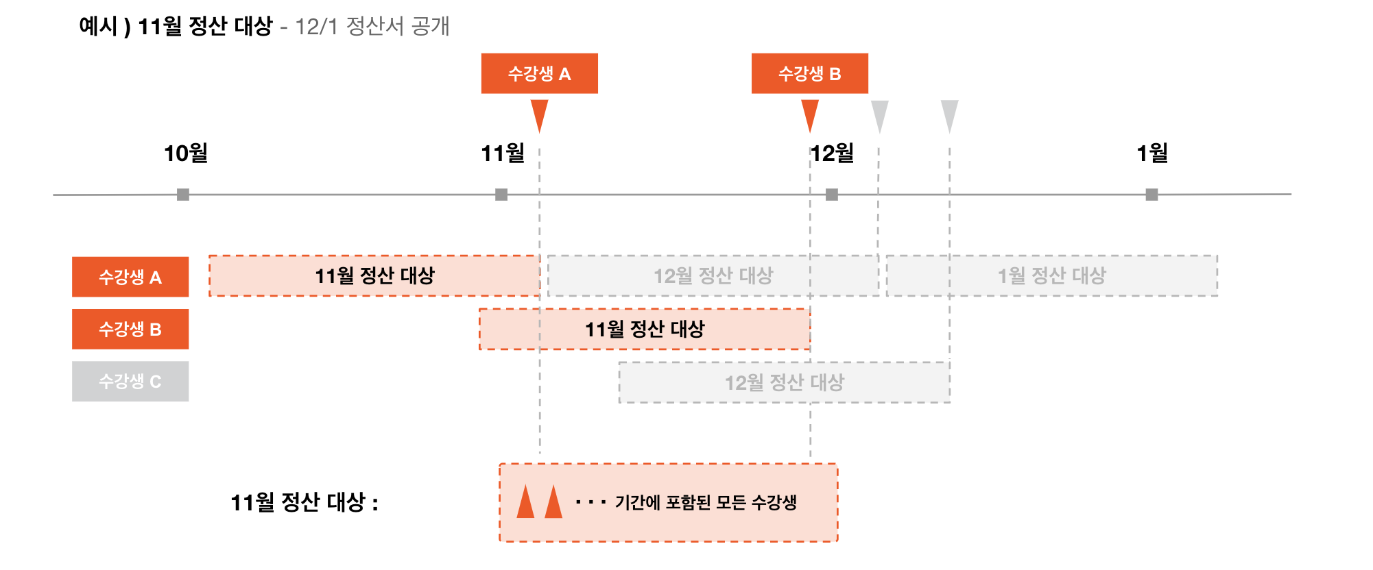 다만, 각 수강생들의 구독 시작일에 따라 수강 월의 익월 정산서에 포함될 수 있습니다.