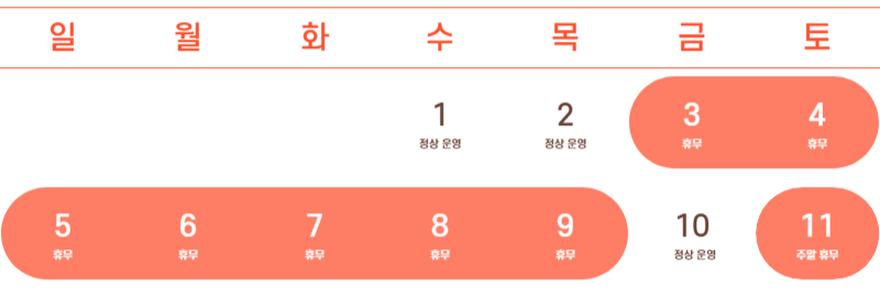 10월 3일 ~ 9일 → 추석 연휴 휴무