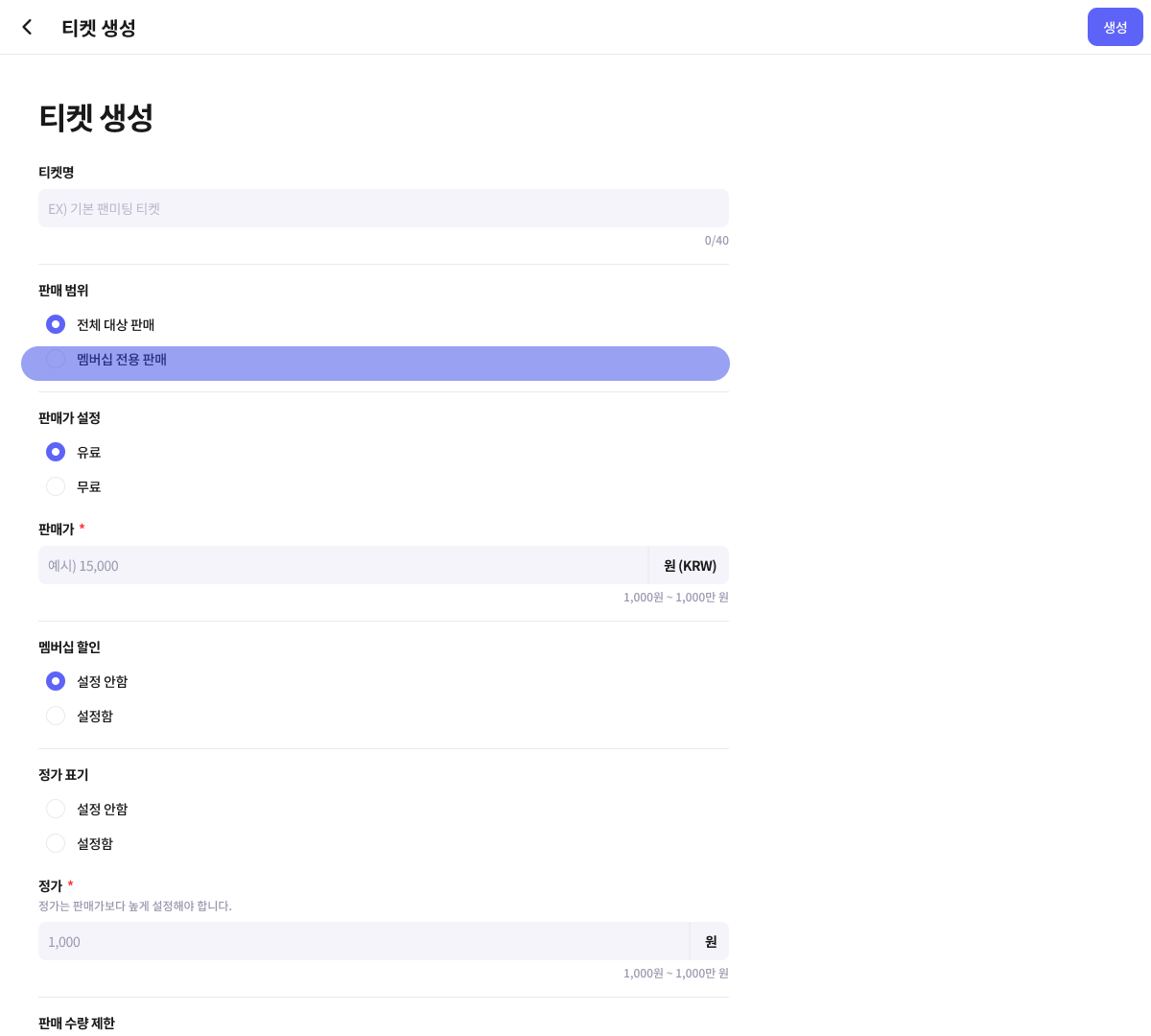 멤버십 전용 판매로 설정하여 멤버십 구독자들만 구매 가능한 티켓을 생성해 보세요.