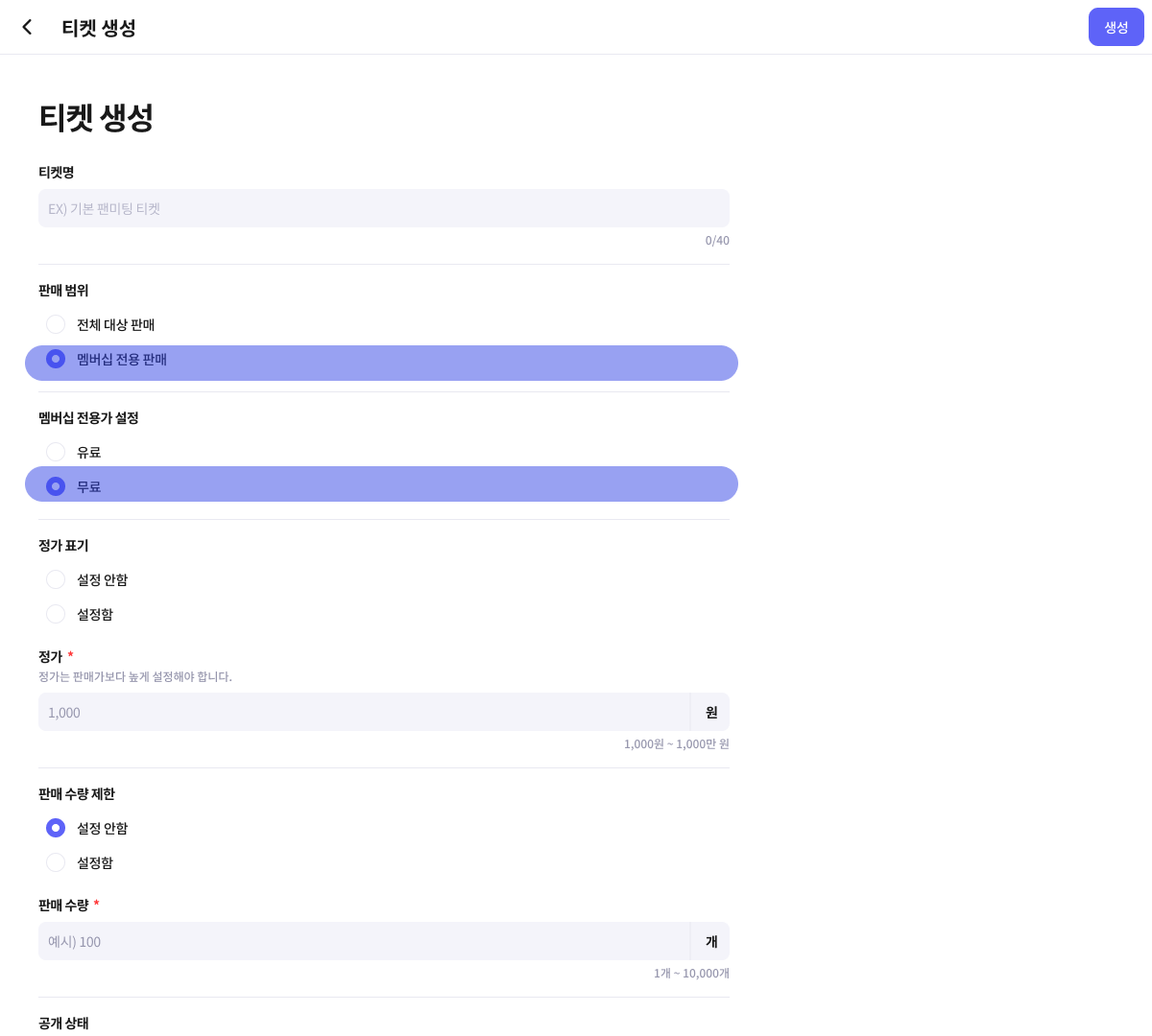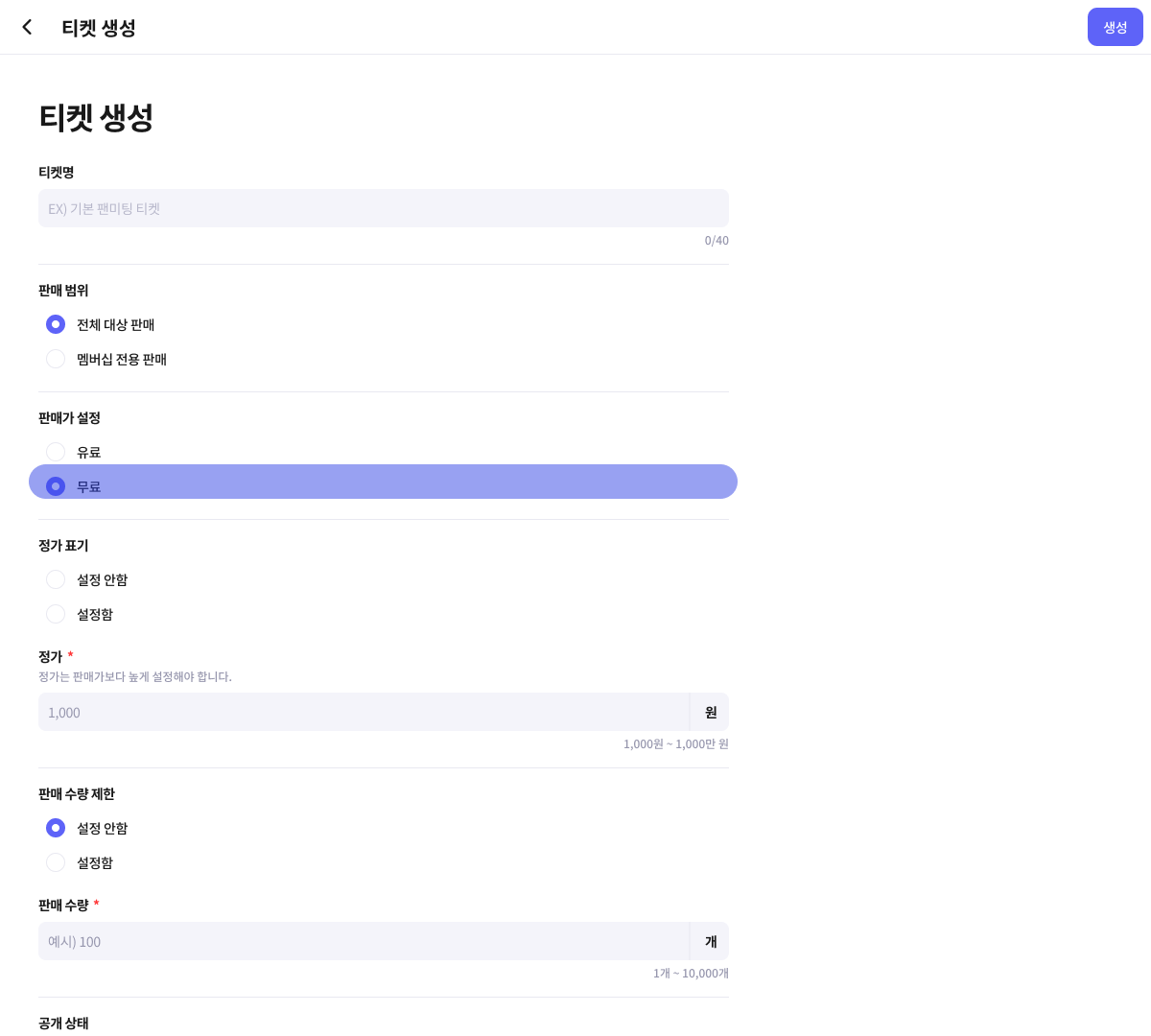 무료로 설정하여, 팬딩 모든 유저들이 무료로 티켓을 구매할 수 있도록 설정해 보세요.