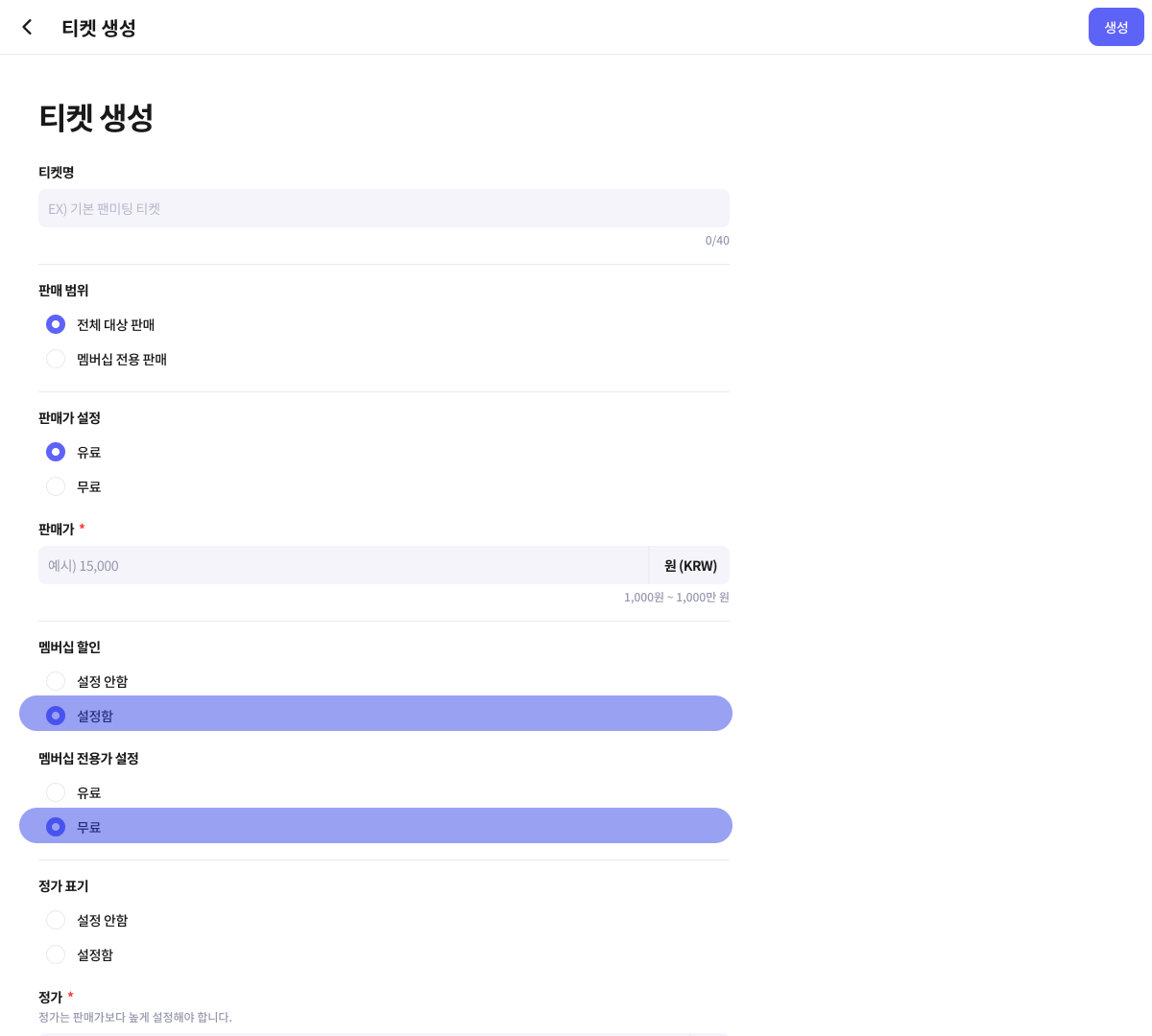 티켓의 판매 범위 및 멤버십 할인 적용 여부에 따라 티켓을 무료로 판매할 수도 있어요.