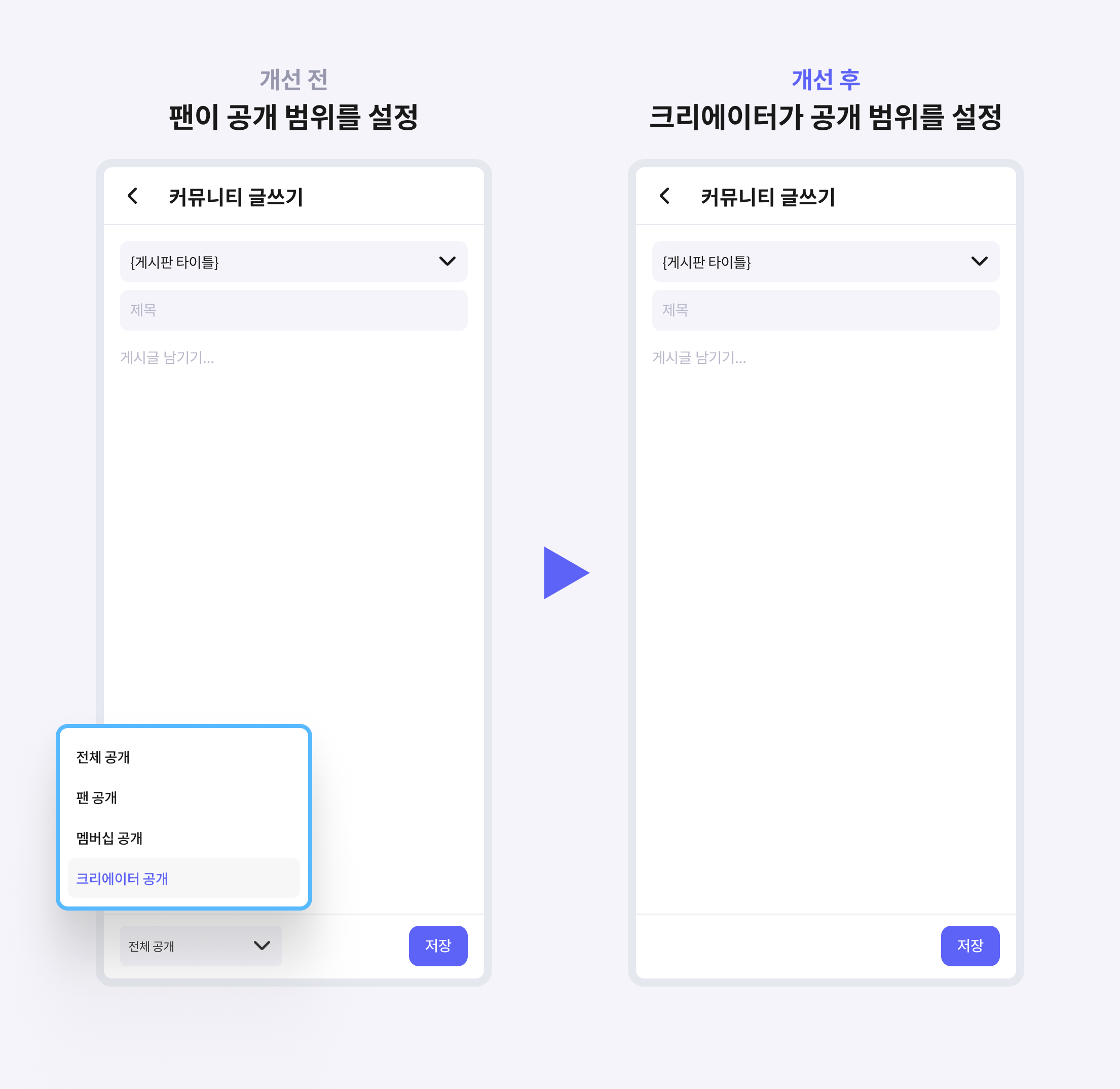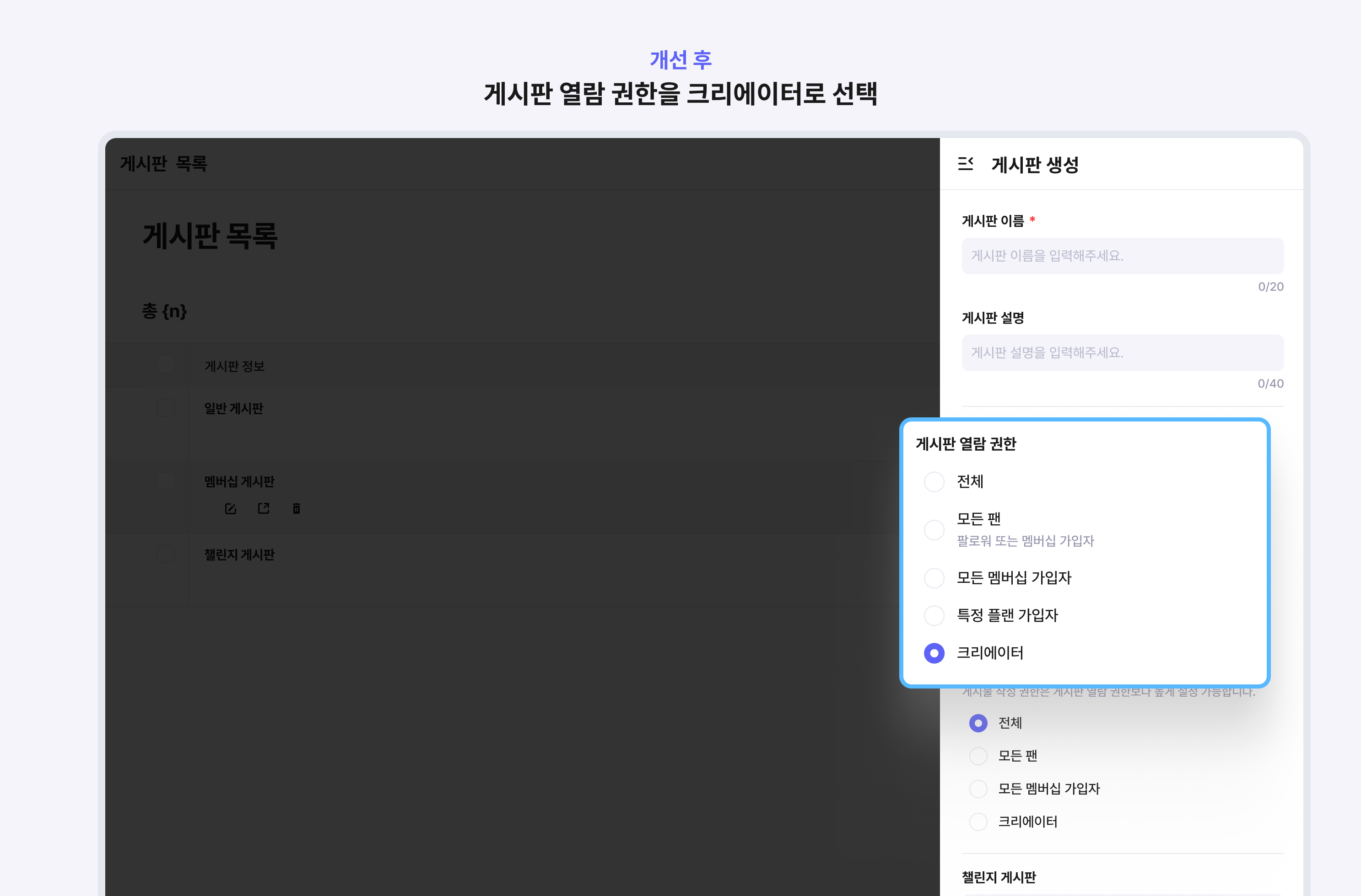 이전에는 크리에이터가 설정한 게시판 열람 권한에도 불구하고, 회원이 직접 본인의 게시물의 열람 권한을 설정할 수 있었어요.