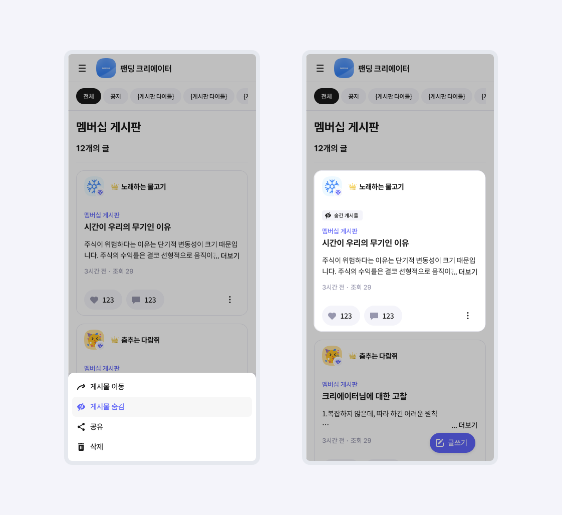 게시물이 숨겨지더라도 작성자는 커뮤니티 내 게시판과 팬 페이지 내 작성한 글 목록에서 이전과 동일하게 해당 게시물을 볼 수 있어요. 그래서 자신의 게시물이 숨겨졌다는 사실을 알 수 없어요.