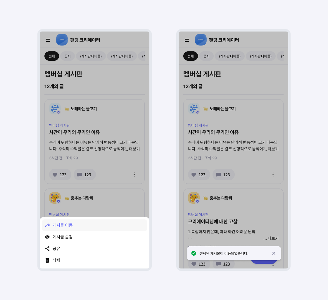 게시판 이용 권한과 관계 없이 자유롭게 게시물을 옮길 수 있어요. 단, 일반 게시판과 챌린지 게시판 사이의 이동은 불가해요.