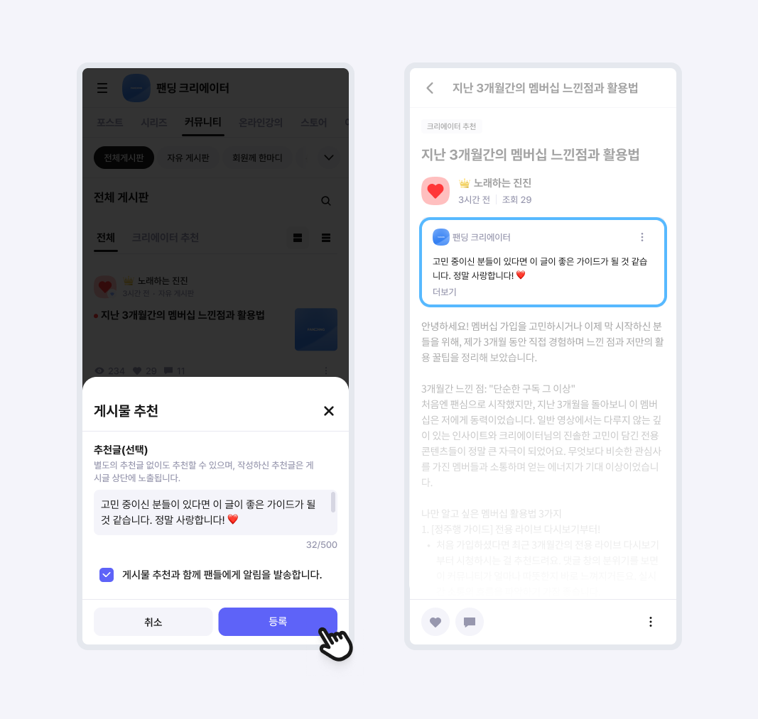 우수한 커뮤니티 게시물을 추천하여 글을 작성한 팬을 공개적으로 샤라웃(shout out)해 보세요.