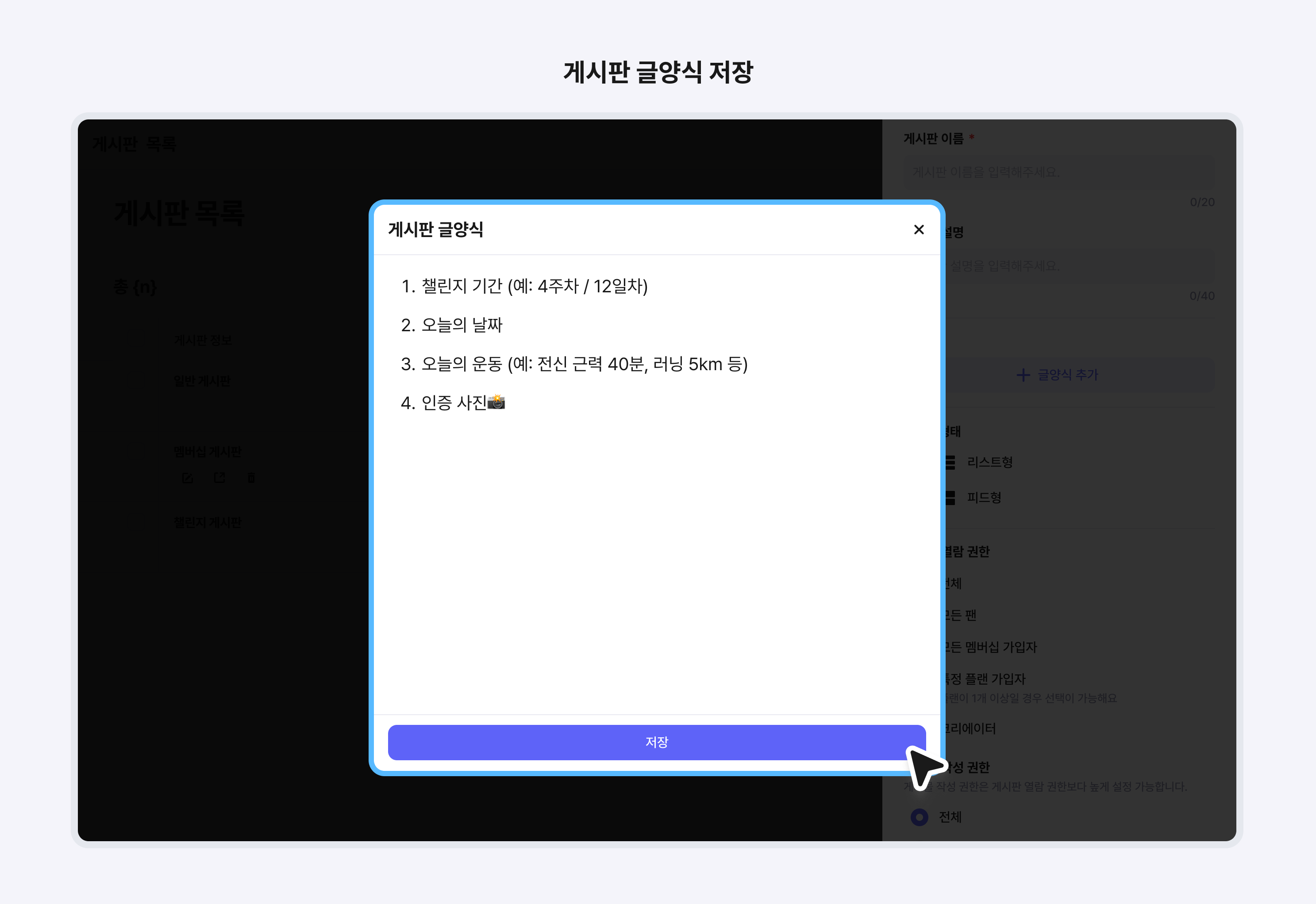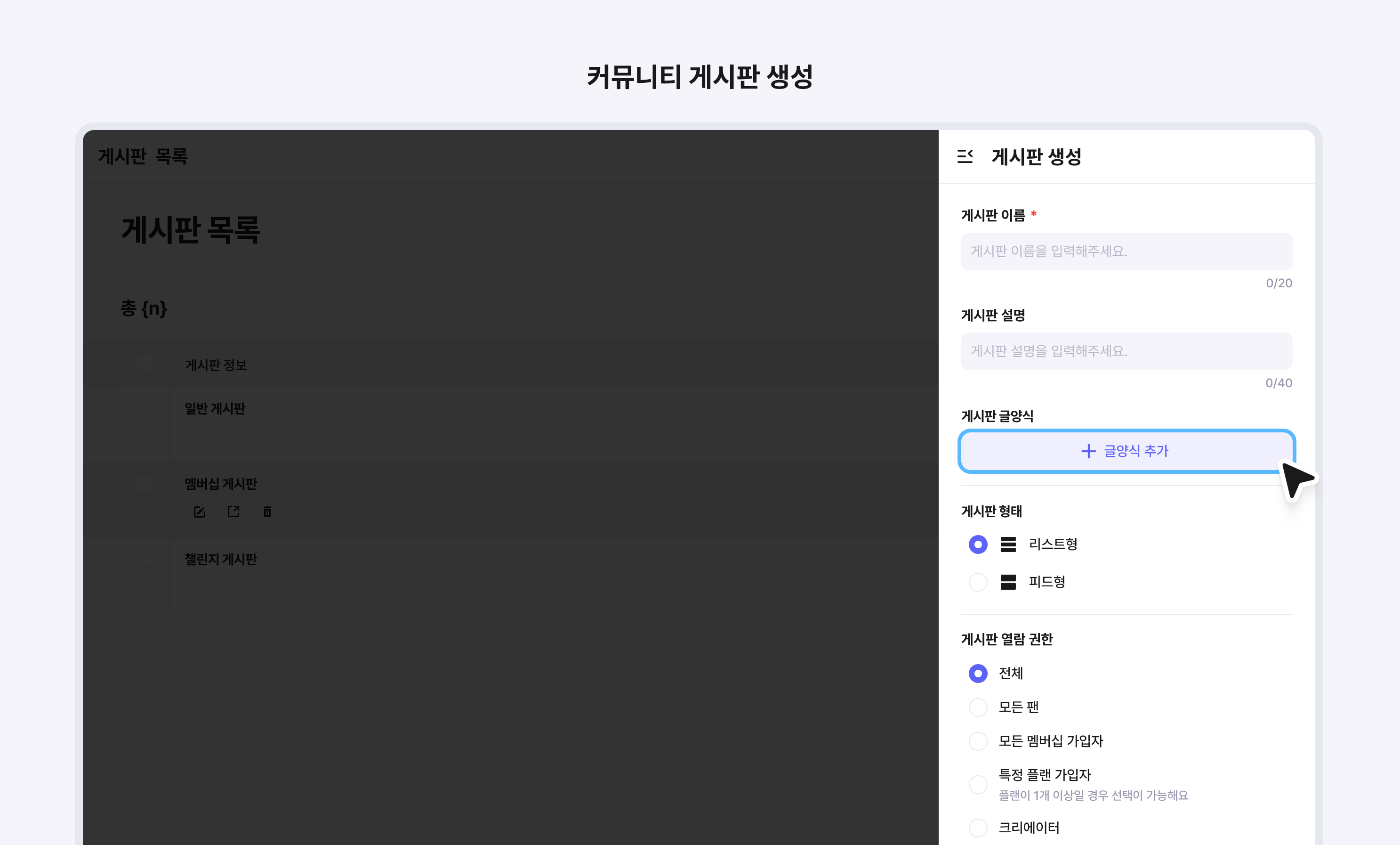 글양식은 게시판을 생성하거나 수정할 때 추가할 수 있어요. 게시판 글양식에서