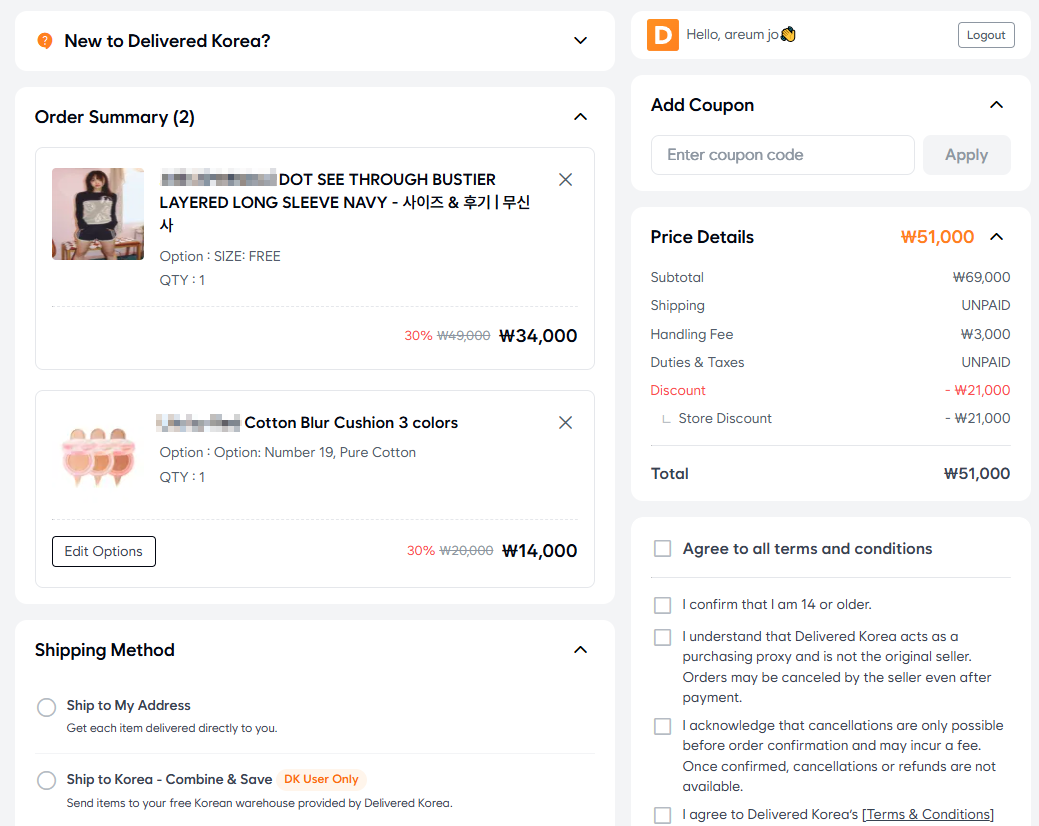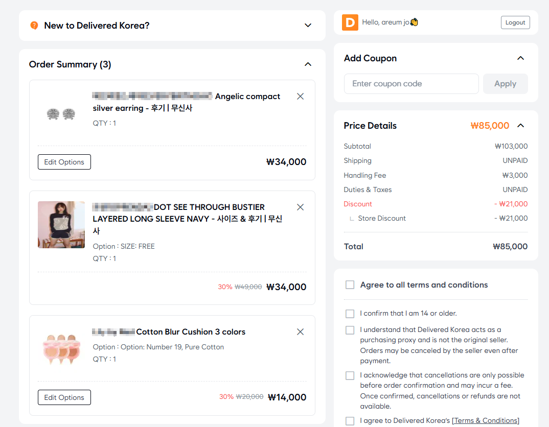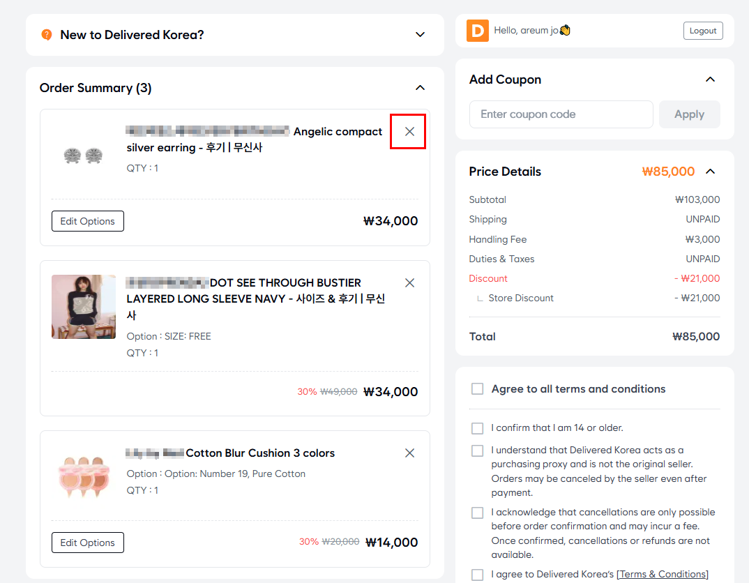 Before making a payment, you can edit the options for each item or remove items from your cart.