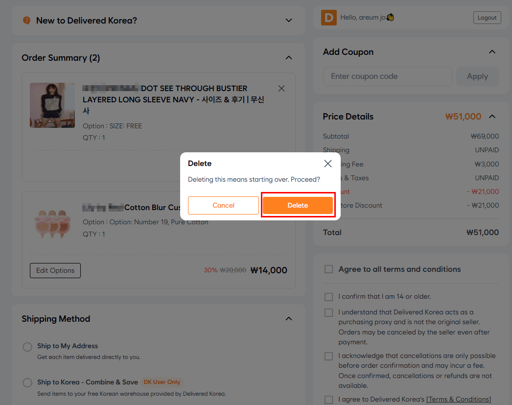 Important: If you want to add the deleted item again, you must return to the shopping site and create a new order form.