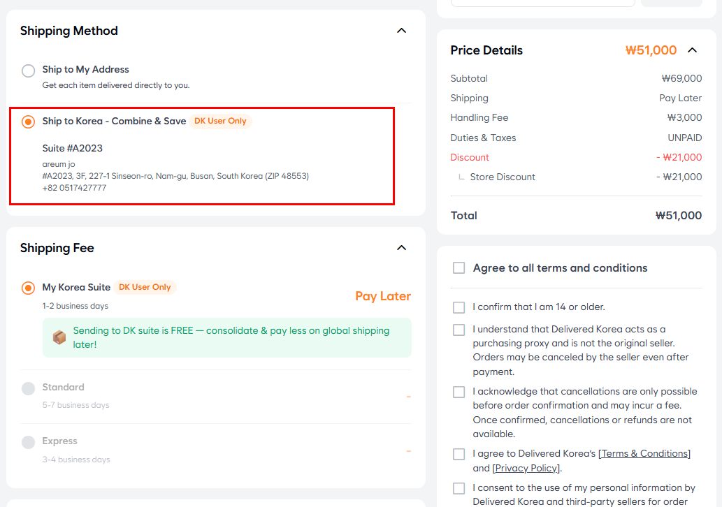 If you choose “Ship to Korea” as the shipping method, the shipping fee section will automatically display “My Korea Suite.”