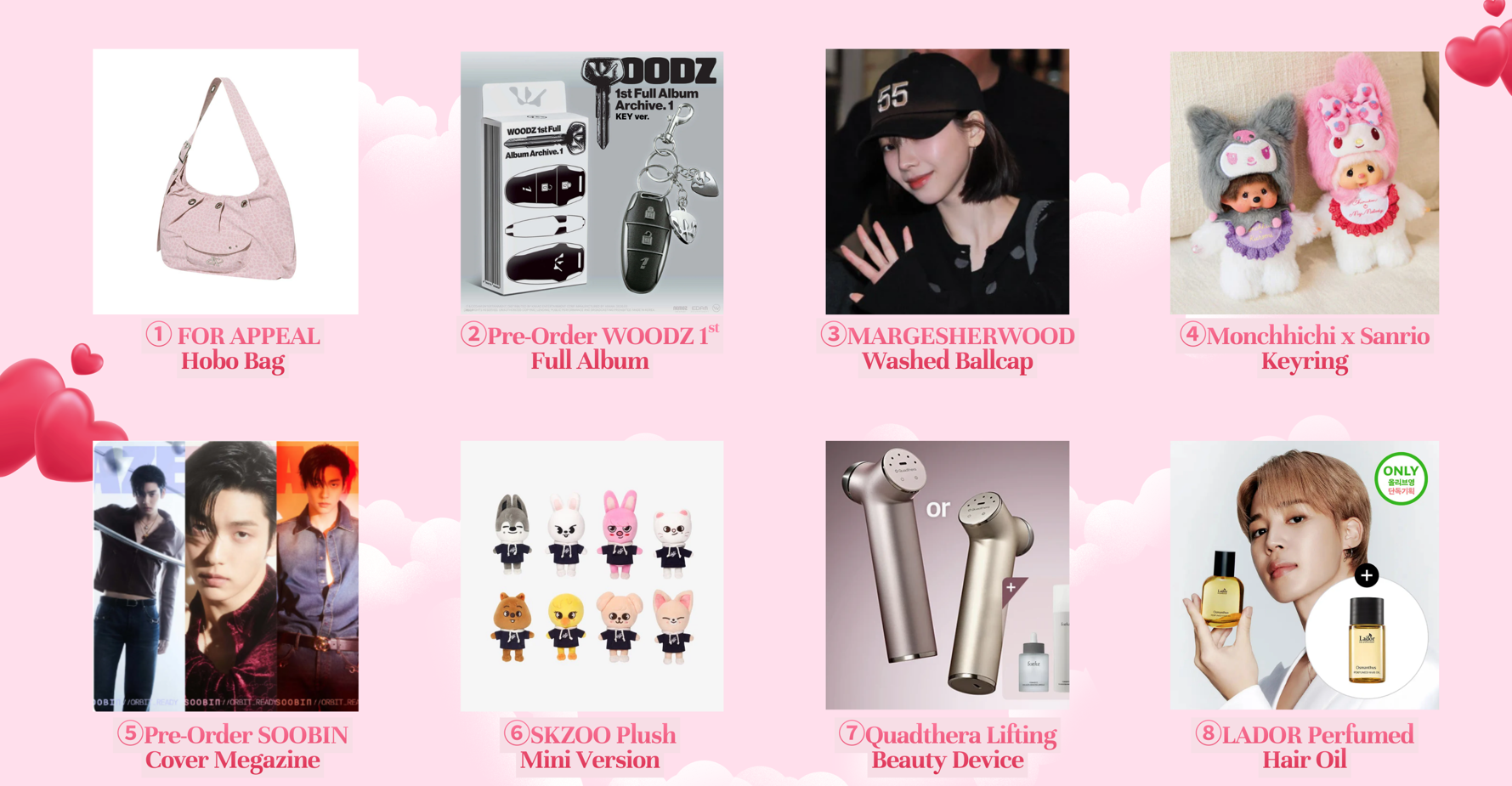 ① FOR APPEAL Hobo Bag, ② WOODZ 1st Full Album, ③ MARGESHERWOOD Washed Ball Cap, ④ Monchhichi X Sanrio Keyring, ⑤ SOOBIN Cover Magazine, ⑥ SKZOO Plush Mini Version, ⑦ Quadthera Lifting Beauty Device, ⑧ LADOR Perfumed Hair Oil