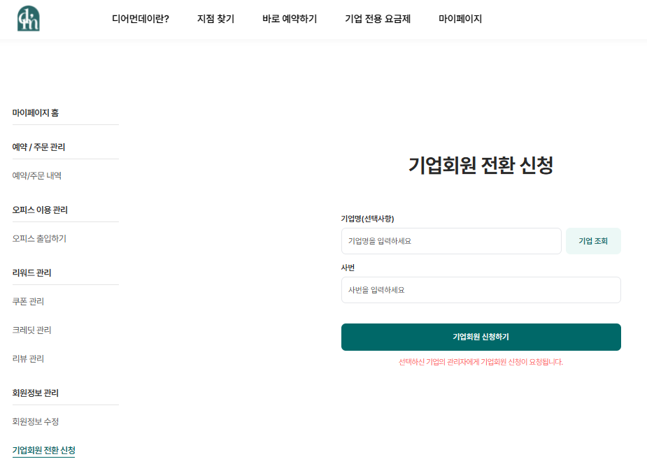> 기업명 및 사번(선택) 작성하여 "기업회원 신청하기" 클릭 > 기업 담당자가 기업회원으로 승인 시, 전환 완료