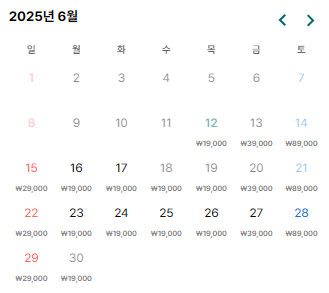 - 예약을 희망하시는 상품 페이지 우측 캘린더에서 예약 가능한 일정 및 가격을 확인하실 수 있습니다.