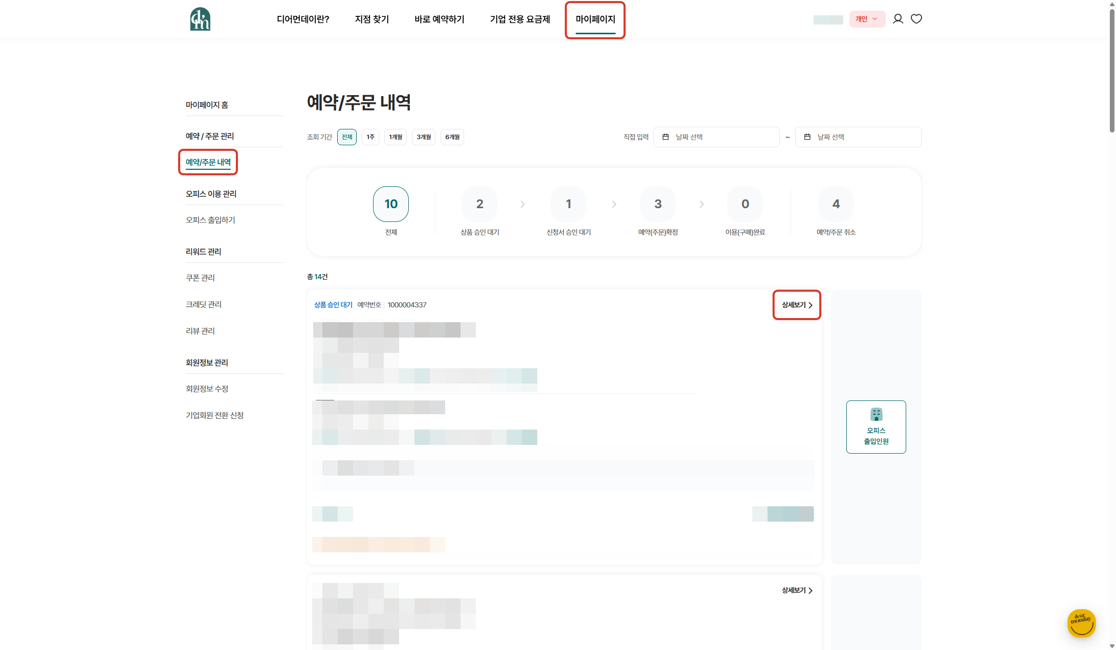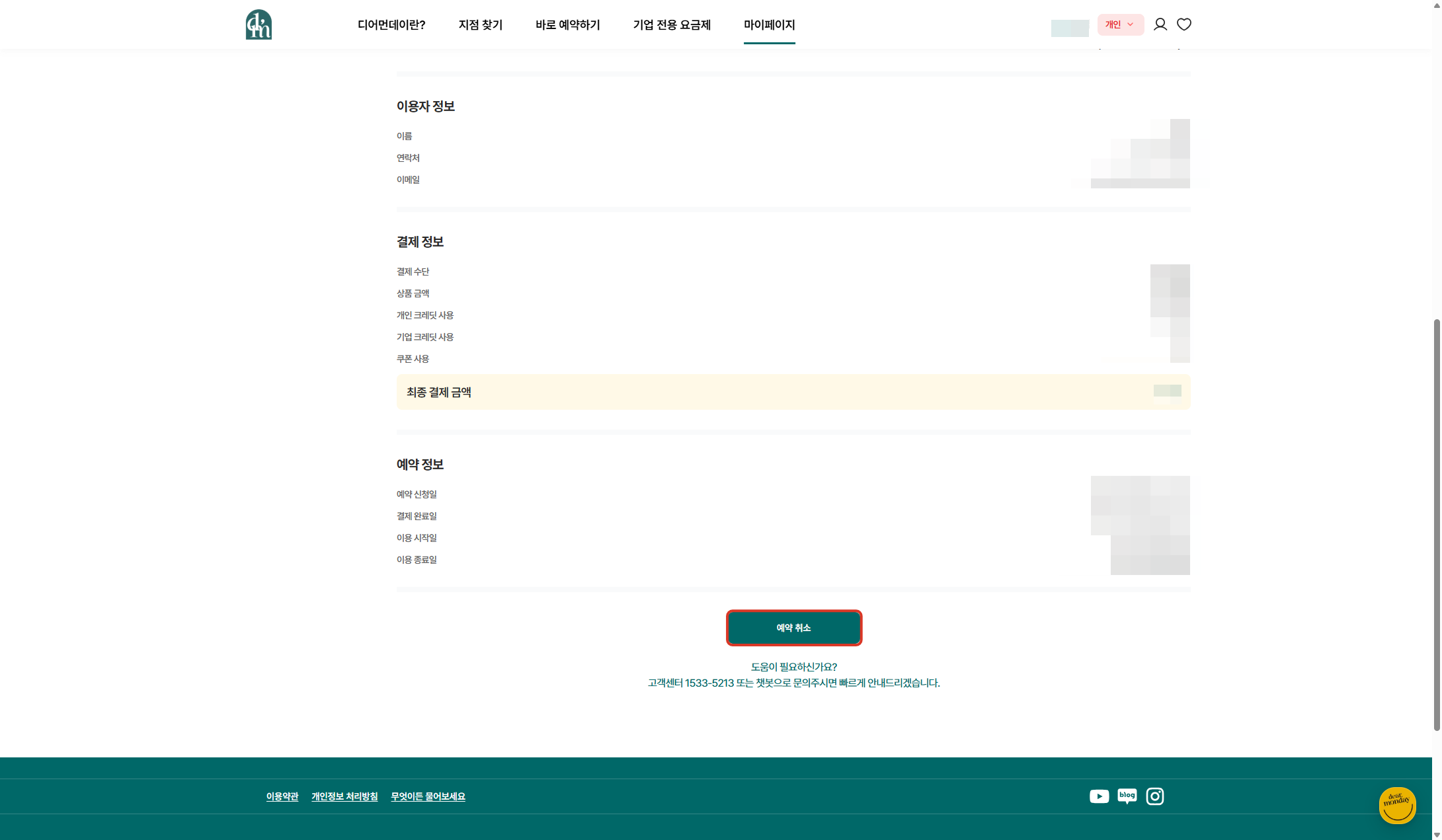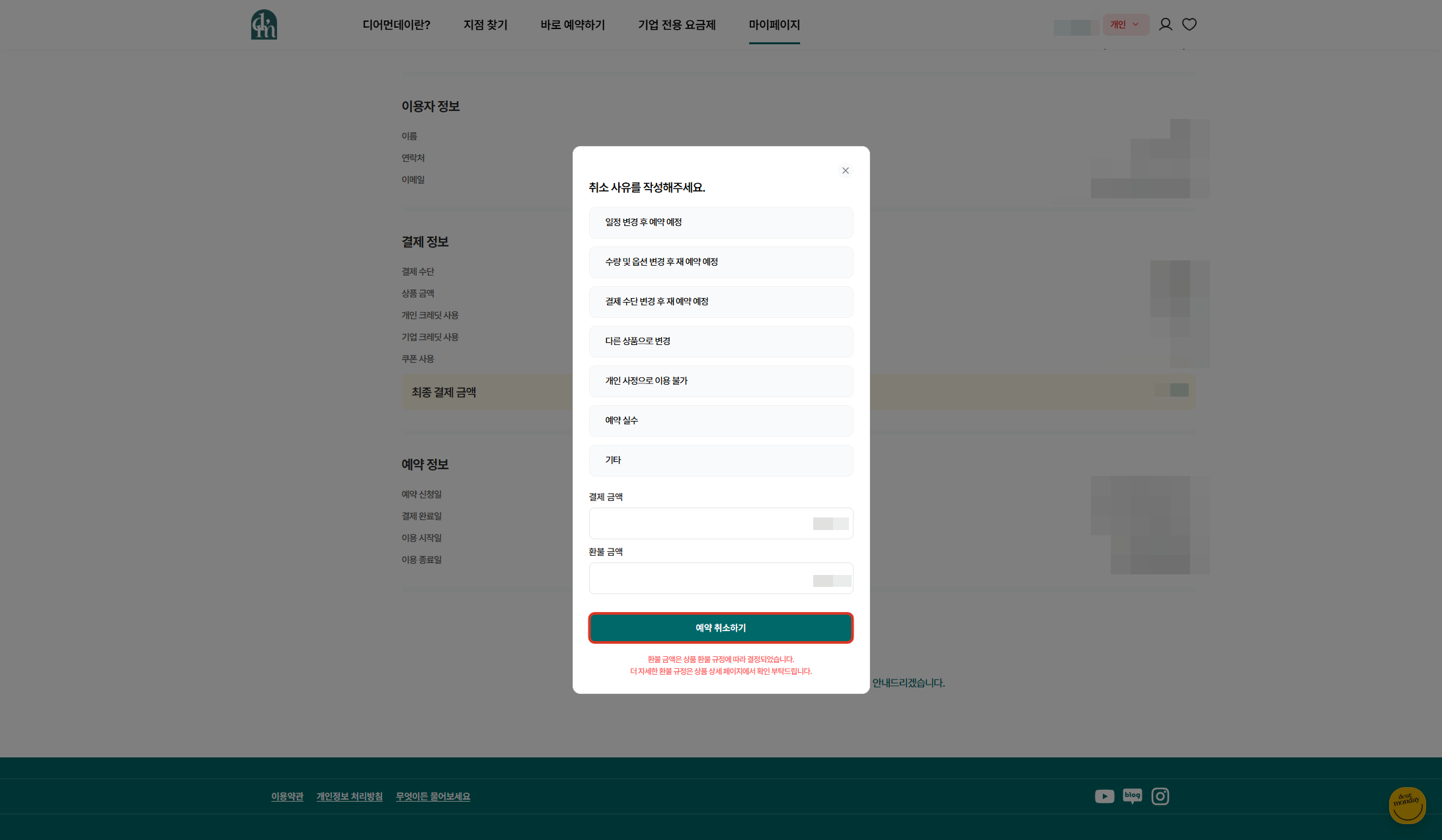 마이페이지 > 예약/주문 내역> 예약건 우측 ‘상세보기’> 우측 하단 ‘예약 취소’ 클릭
