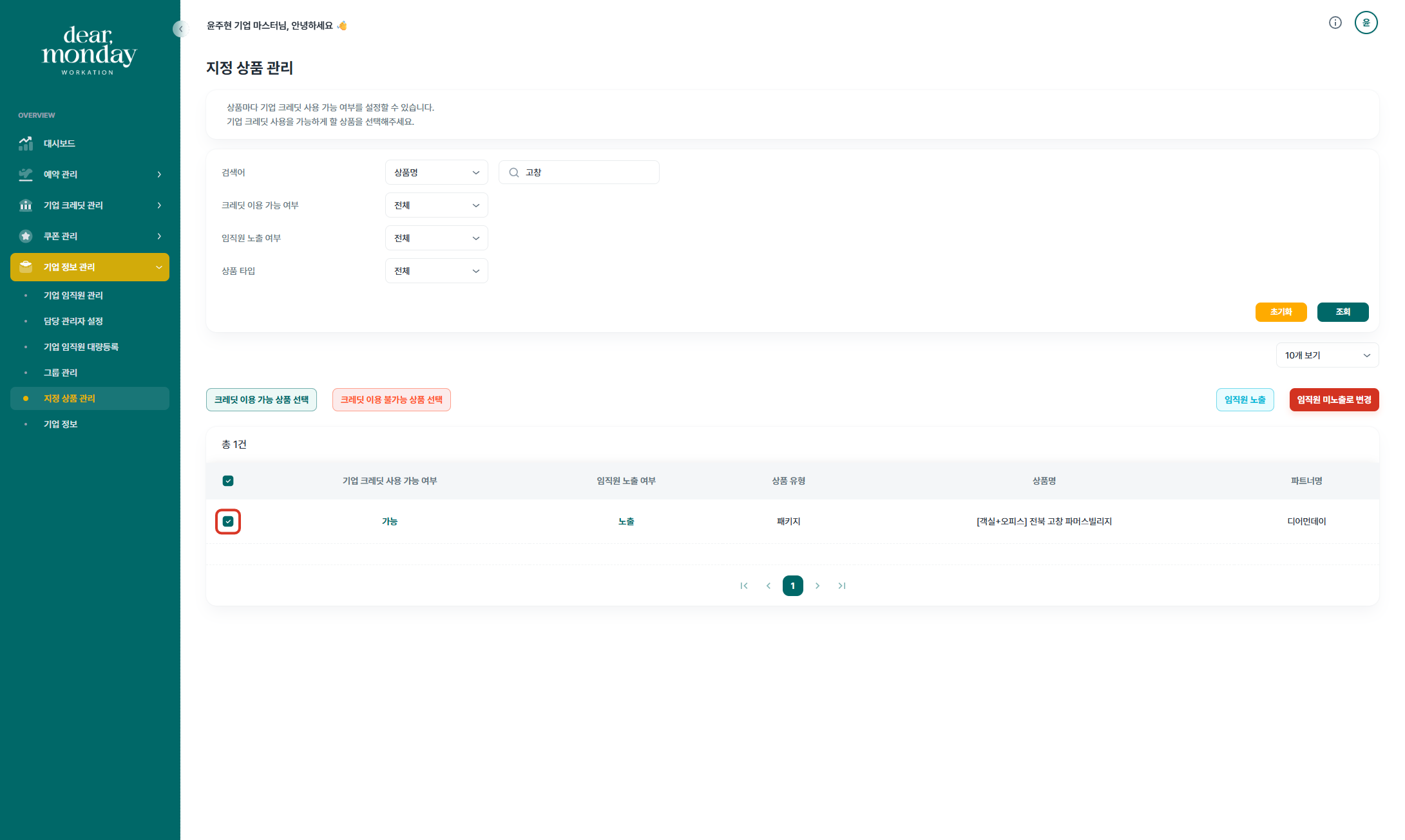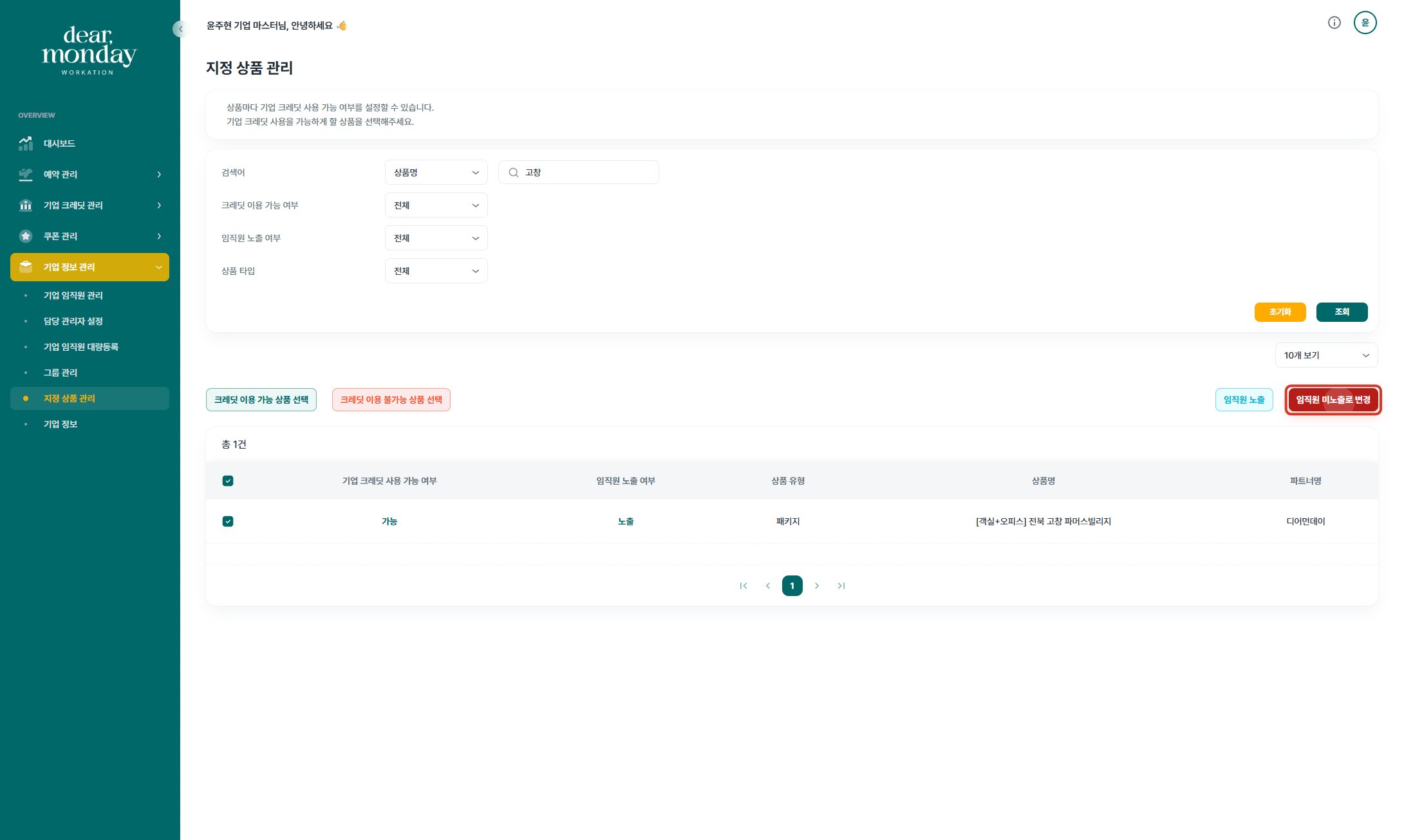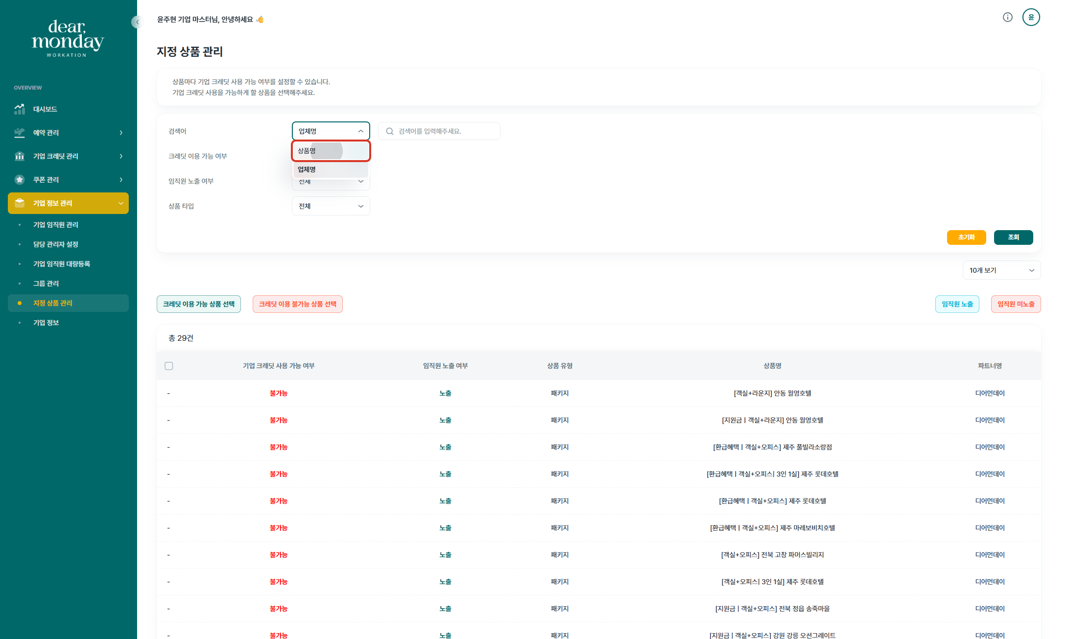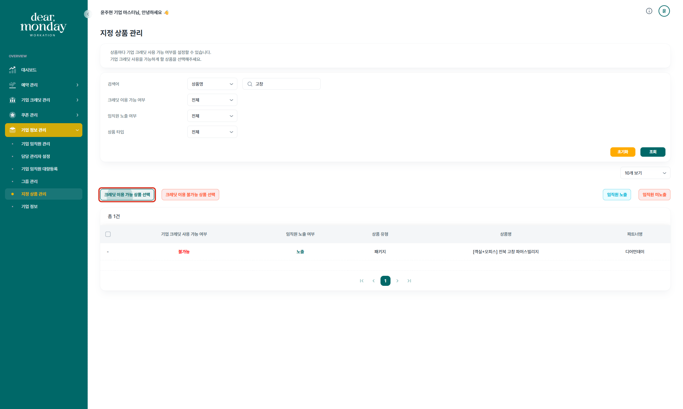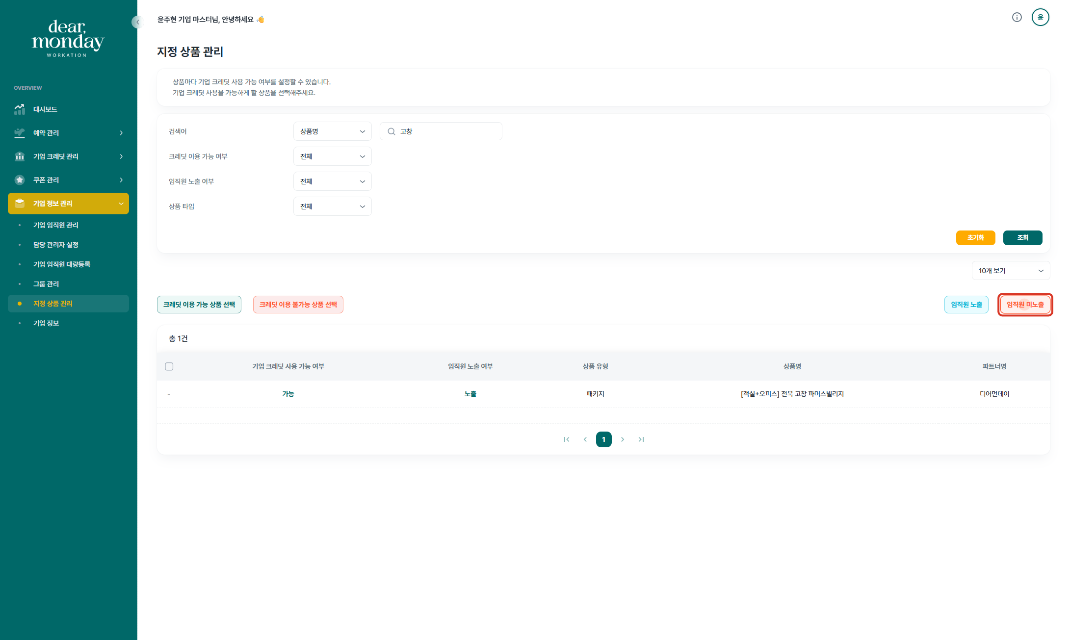 기업담당자께서는 디어먼데이 기업마스터 페이지(https://org.dearmonday.io/)에서 상품의 임직원 노출 여부와 기업 크레딧 사용 여부를 설정하실 수 있습니다.