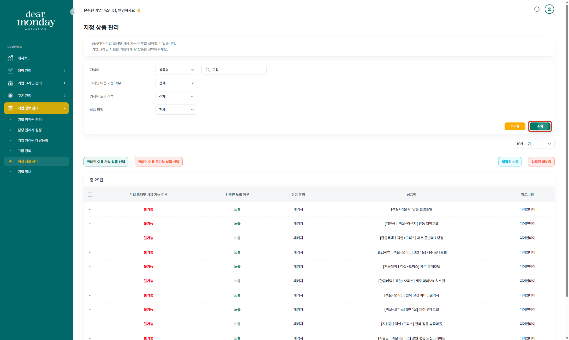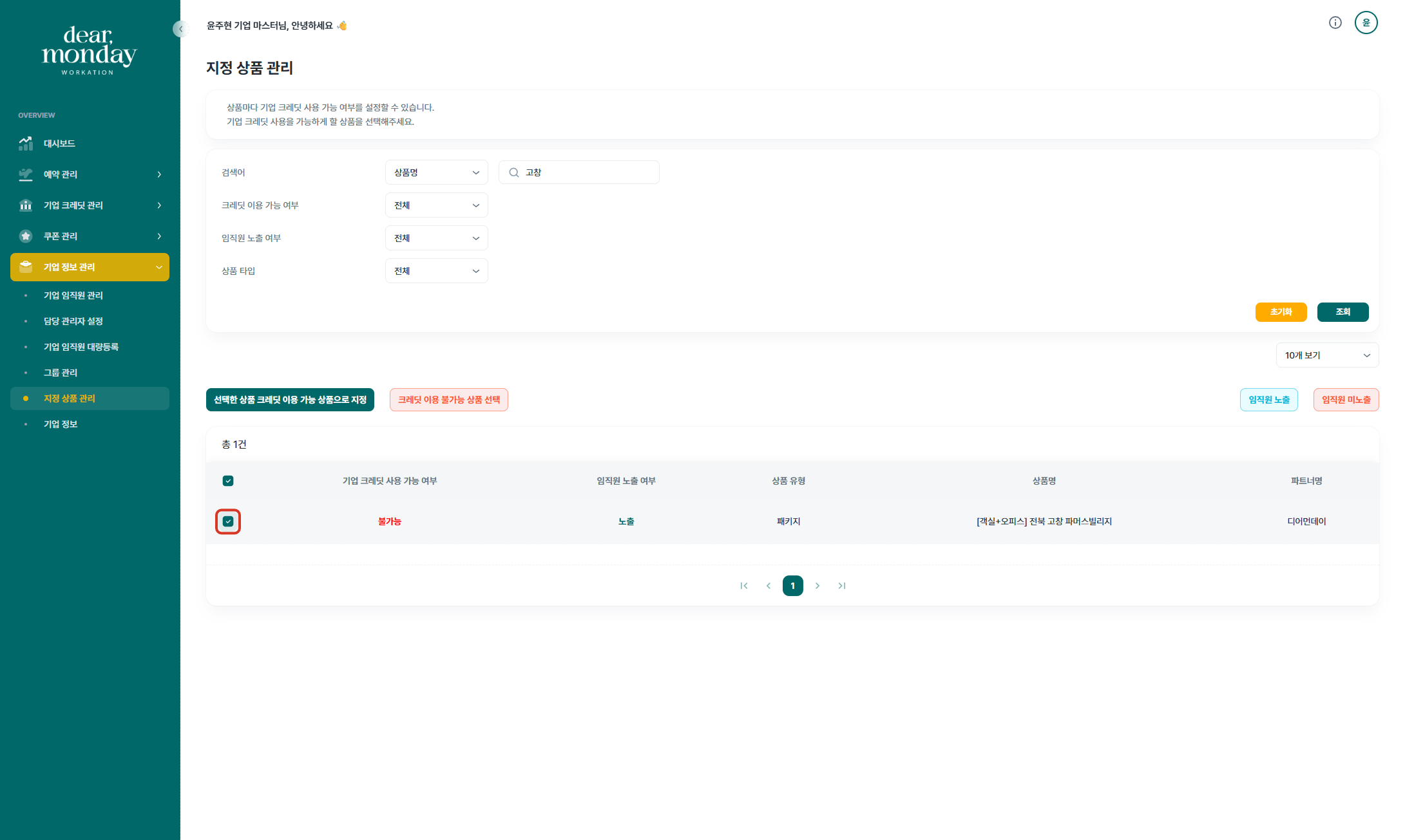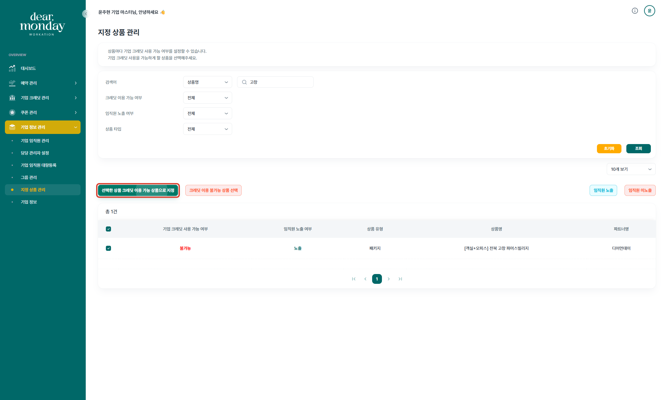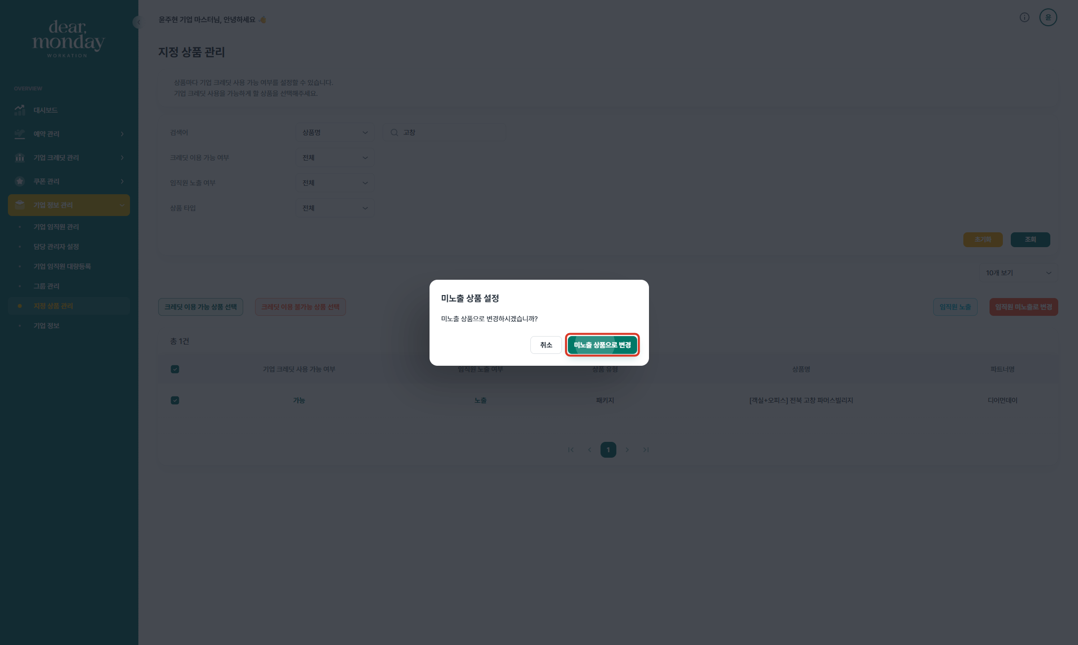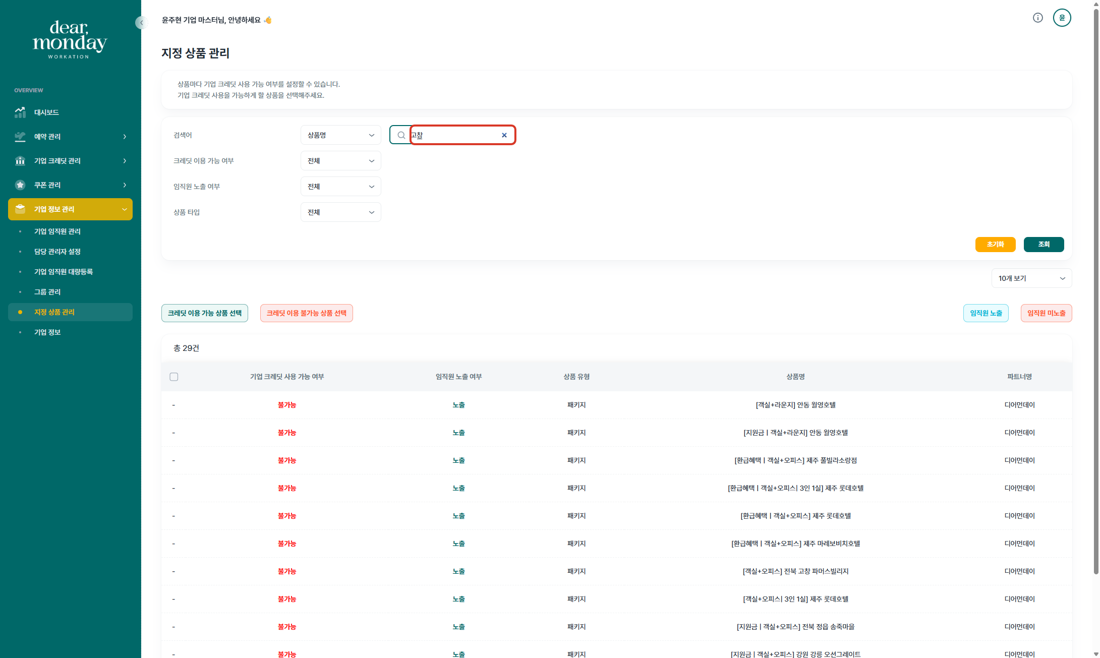 기업담당자께서는 디어먼데이 기업마스터 페이지(https://org.dearmonday.io/)에서 상품의 임직원 노출 여부와 기업 크레딧 사용 여부를 설정하실 수 있습니다.