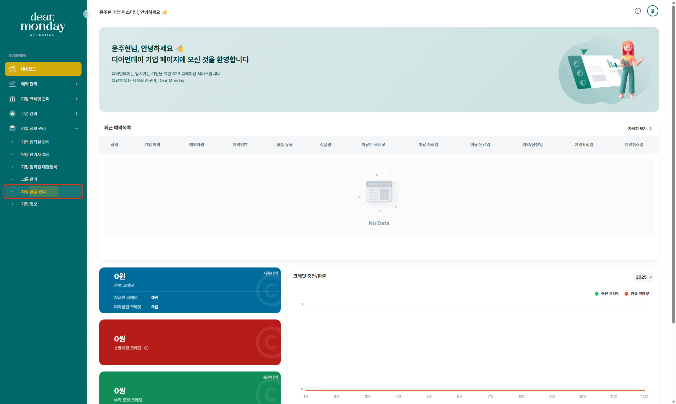 1. 디어먼데이 기업마스터 페이지 접속 후, 좌측 메뉴에서 [기업 정보 관리] → [지정 상품 관리]를 클릭합니다.