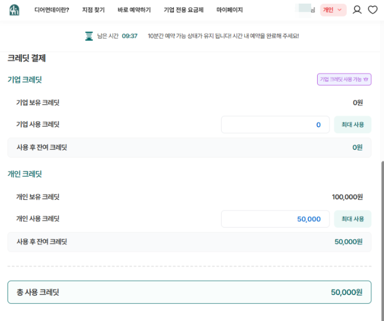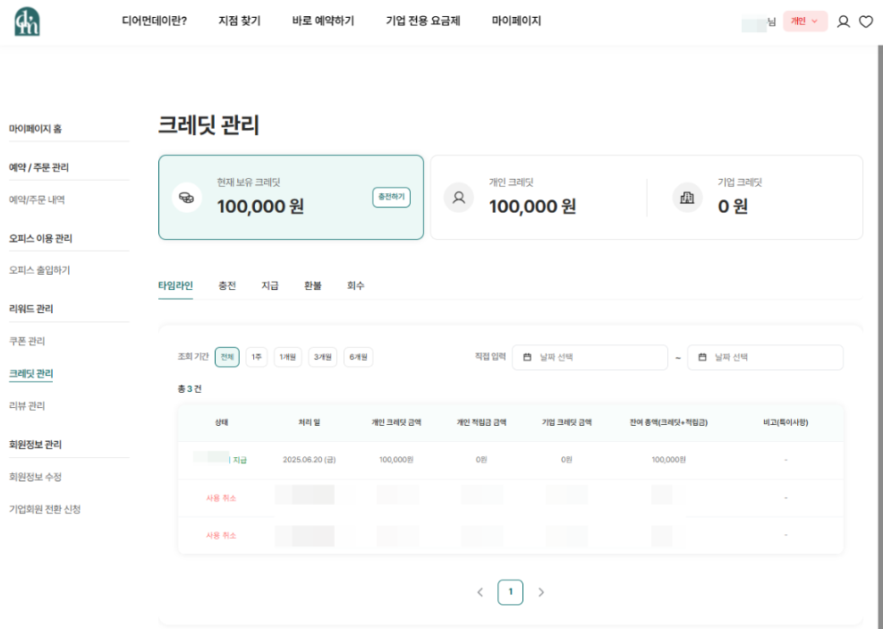 1. 지급된 크레딧 조회 방법디어먼데이 홈페이지 상단의 마이페이지 클릭 > 좌측 "크레딧 관리" 탭 클릭2. 결제 시 크레딧 사용 방법① 결제페이지에서 "개인 사용 크레딧" - 사용할 금액 입력② 결제 필요 금액에서 크레딧 적용된 부분 확인 가능