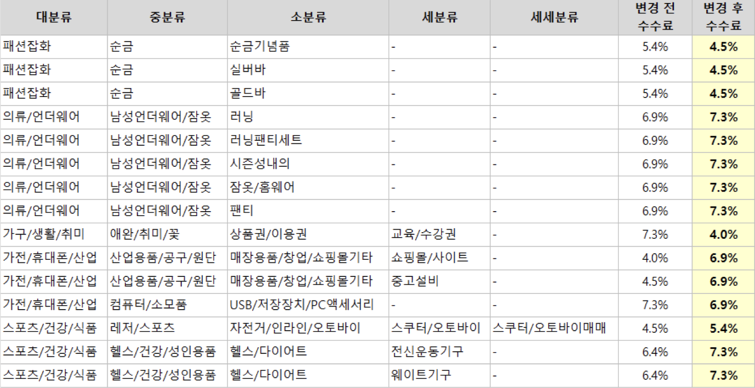 일부 카테고리의 수수료율이 변경됨 (세부 카테고리별 변경 전/후 수수료는 표 참고)