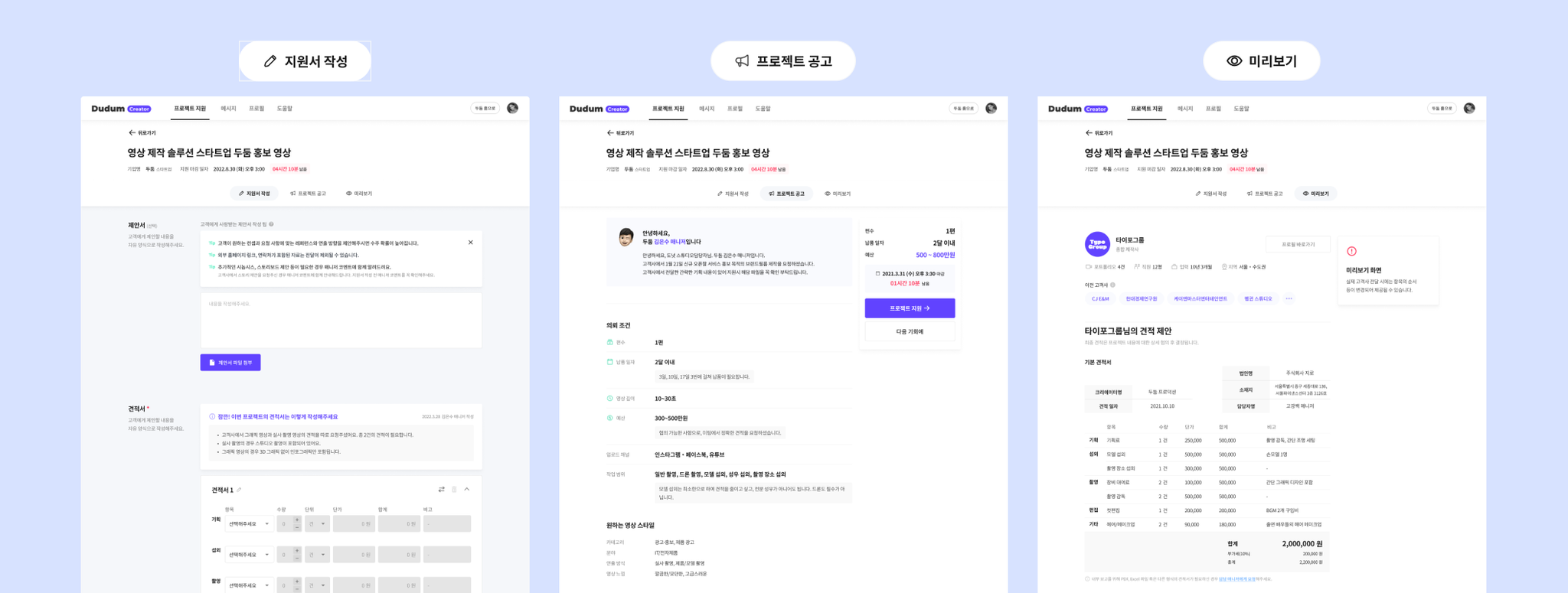 지원서 작성: 제안서와 견적서를 작성하고, 고객사에 제안하는 견적 입력하는 페이지입니다.