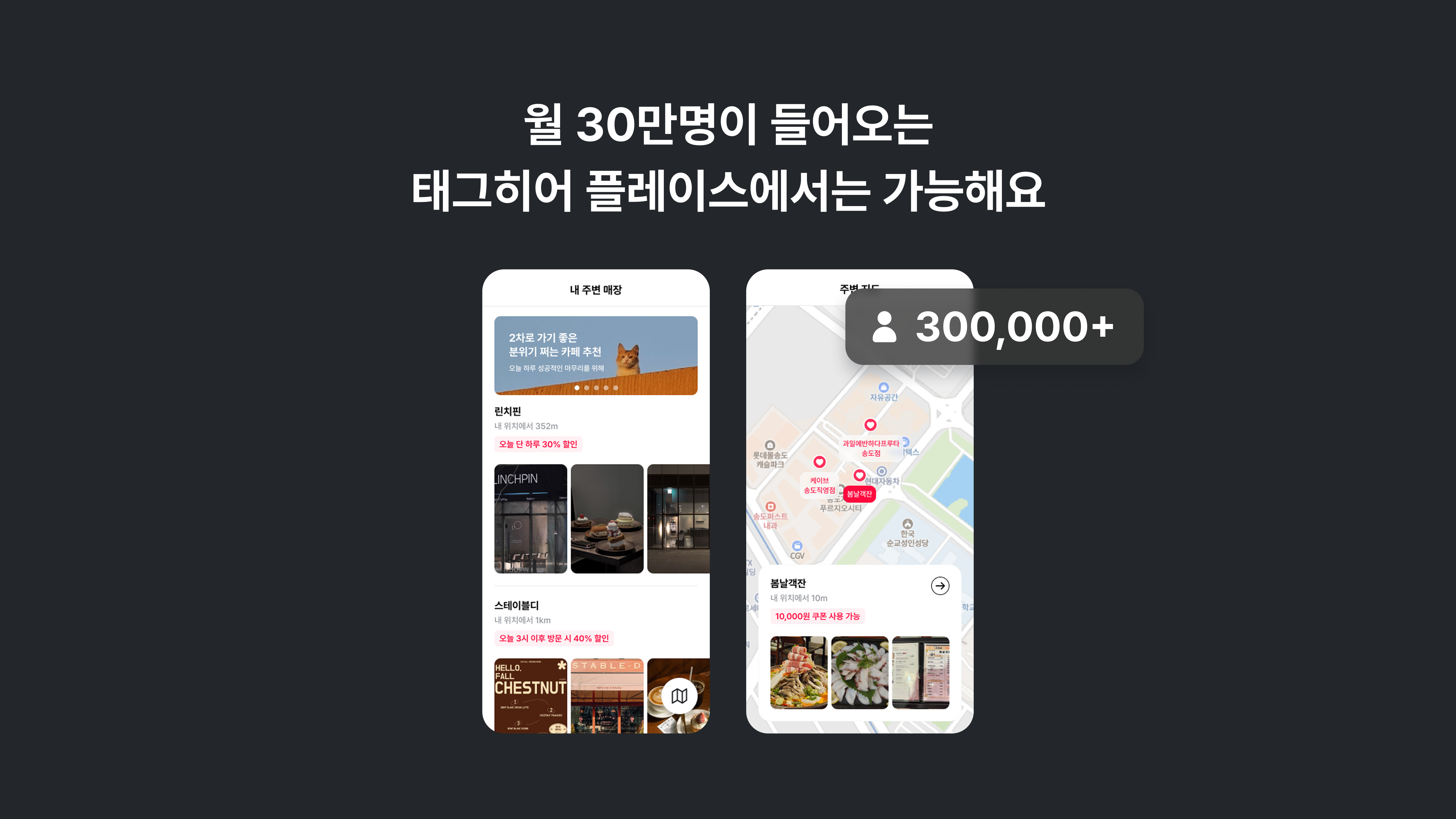 태그히어를 이용하는 월 30만명의 고객들께 사장님의 매장이 보여져요!