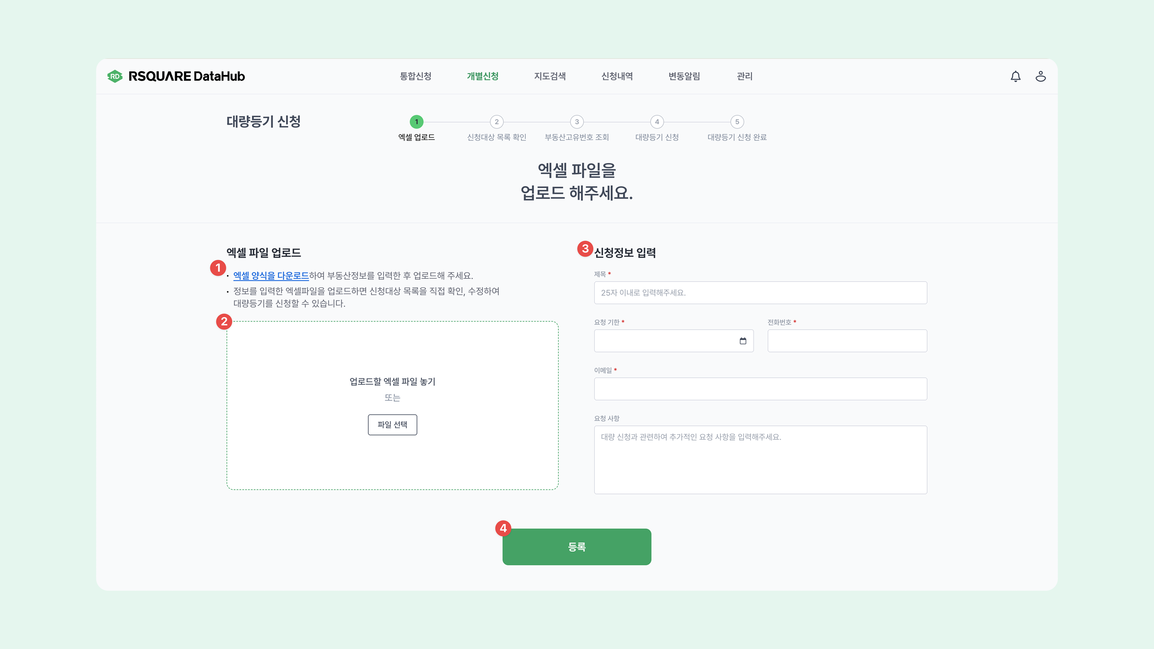 개별신청 > 대량등기메뉴에서 엑셀 양식을 다운로드하고 부동산구분(토지,건물,집합)과 주소를 입력합니다.주소는 지번 또는 도로명 주소를 포함한 상세 주소까지 정확히 입력해 주세요.