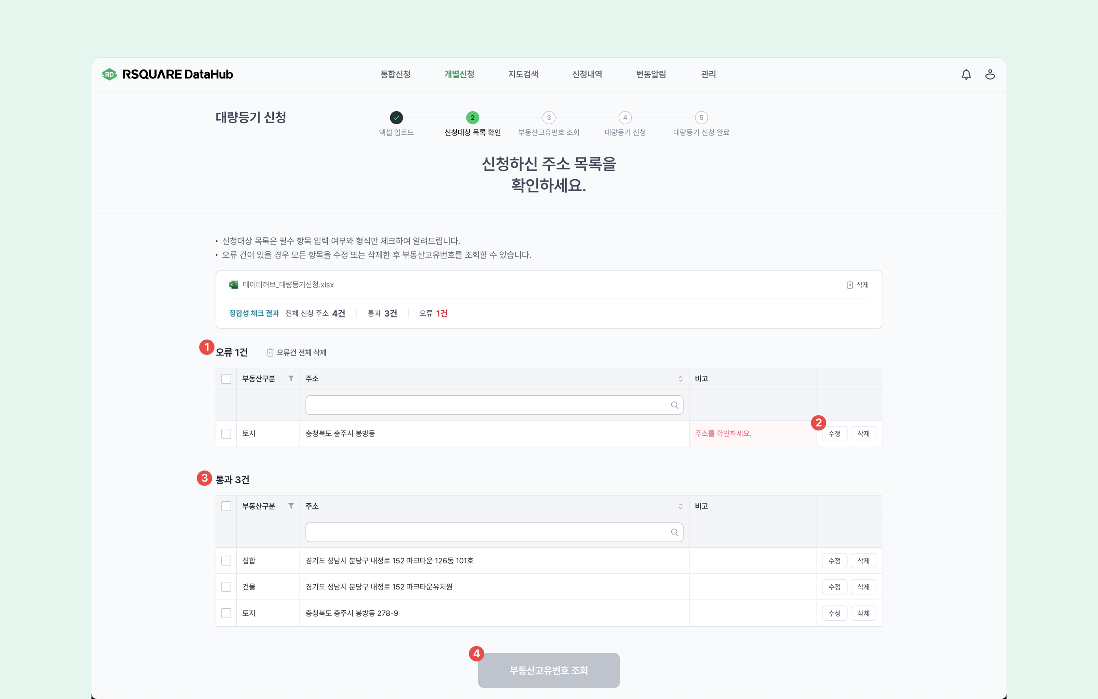 대량등기는 엑셀 업로드 > 신청대상 목록 확인 > 부동산고유번호 조회 > 주소지 수정·확정 > 대량등기 신청 순서로 진행됩니다.