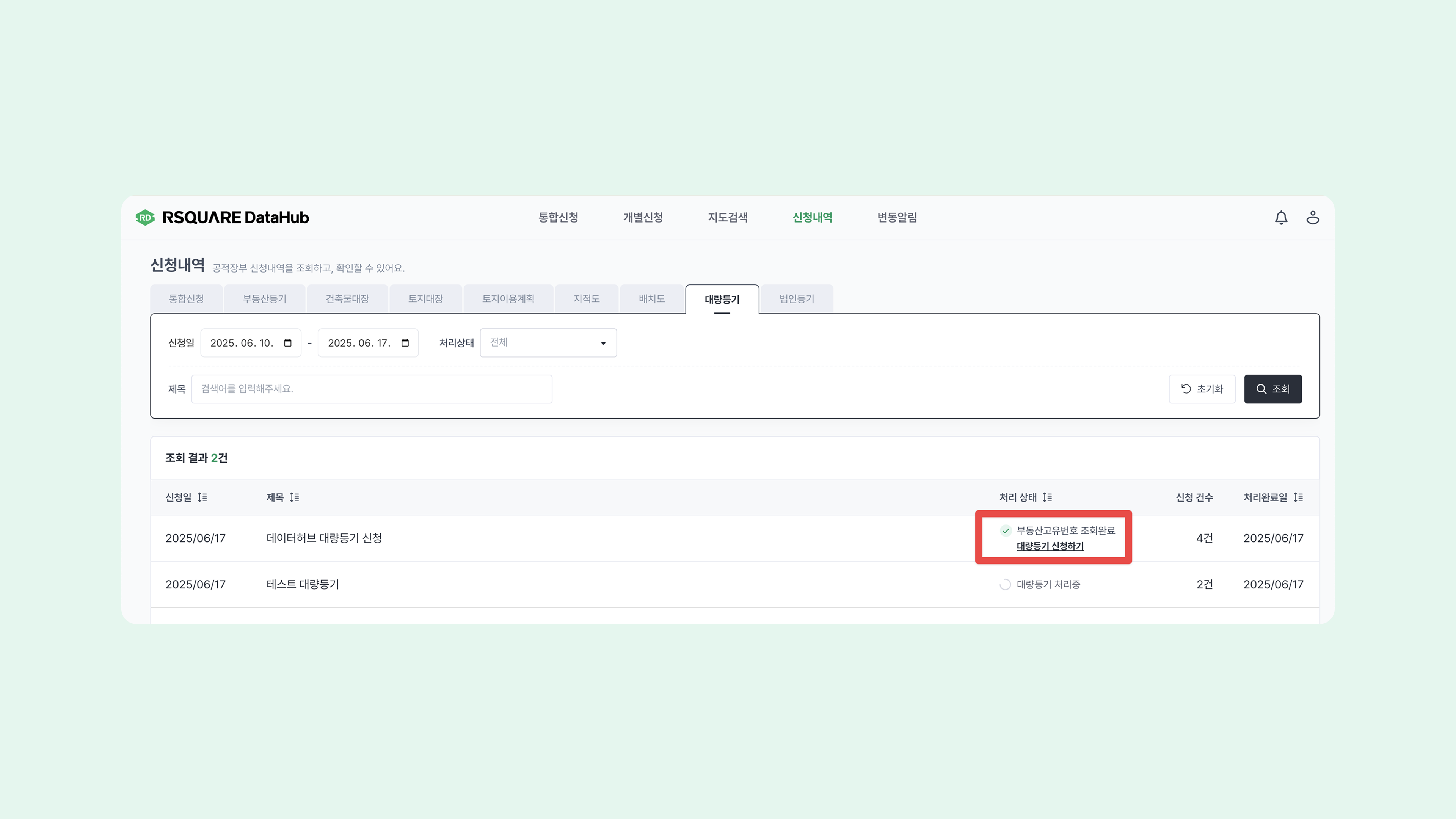 대량등기 신청이 완료되면 신청내역 > 대량등기 메뉴에서 신청 결과를 확인할 수 있습니다.