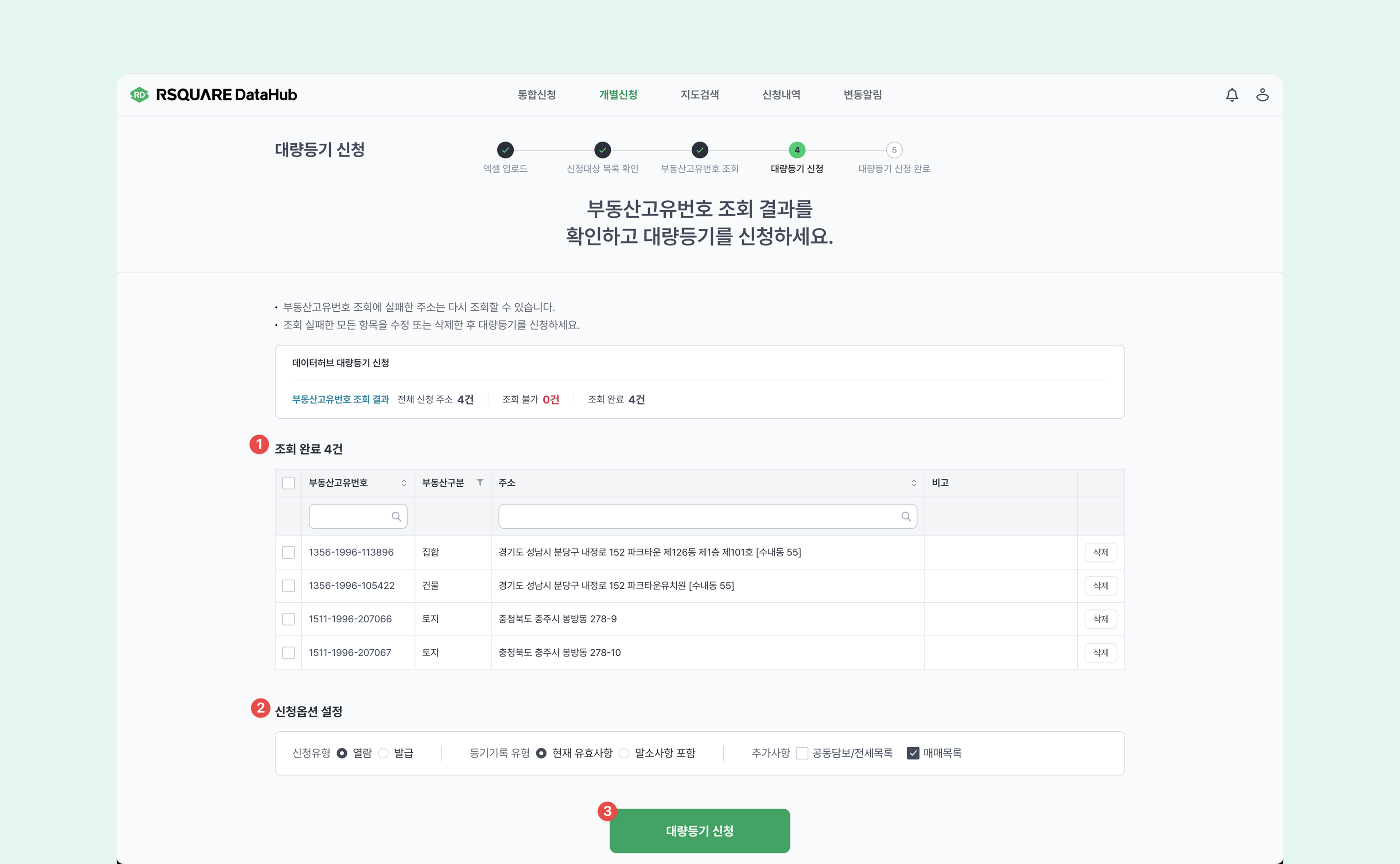 대량등기 신청 화면에서 부동산고유번호 조회가 완료된 목록을 확인하고 정보를 수정하거나 삭제할 수 있습니다.