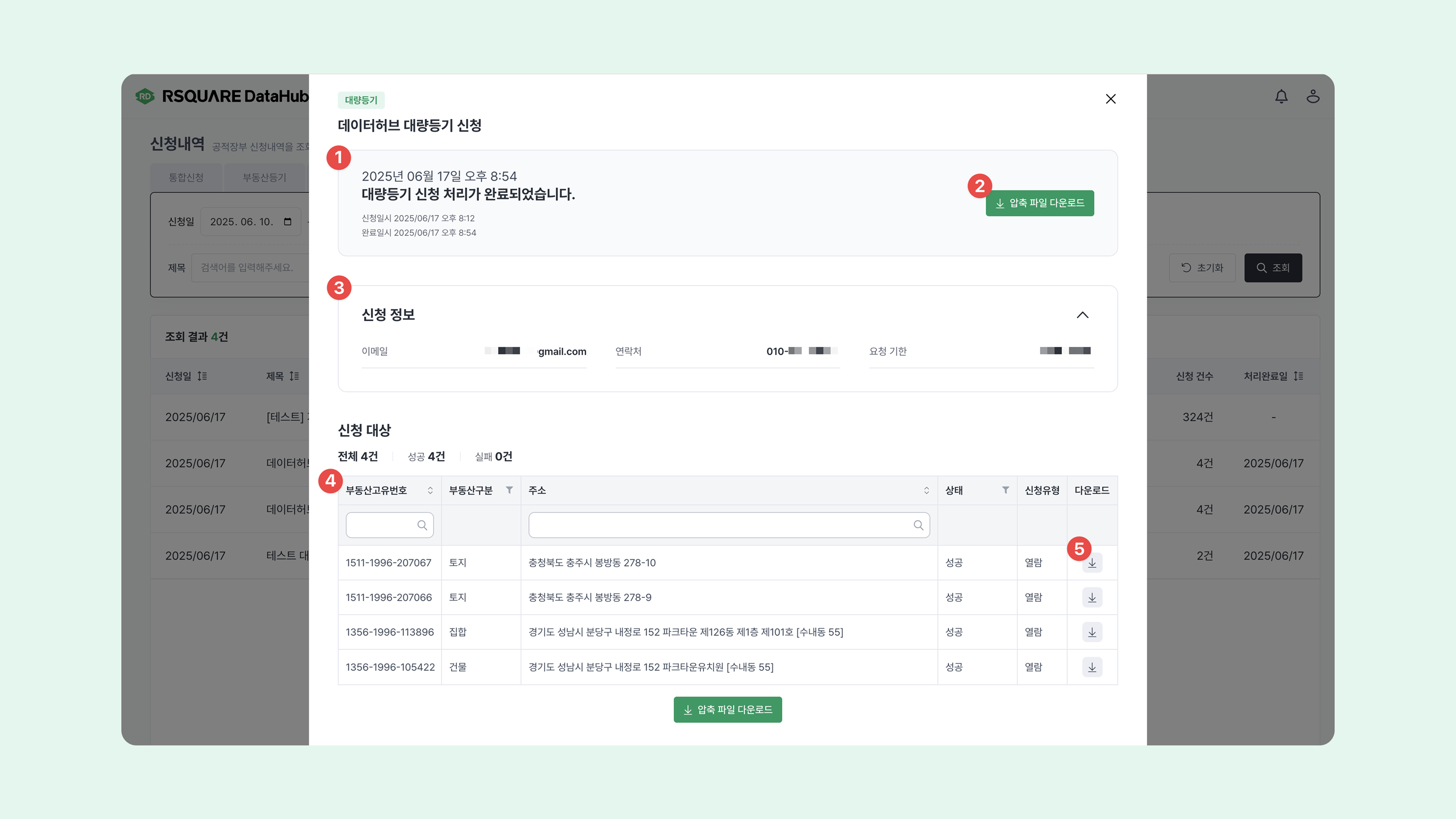 압축파일 다운로드버튼을 클릭하면 신청한 모든 등기부등본을 압축파일로 한 번에 다운로드 받을 수 있습니다.신청 정보를 확인할 수 있습니다.