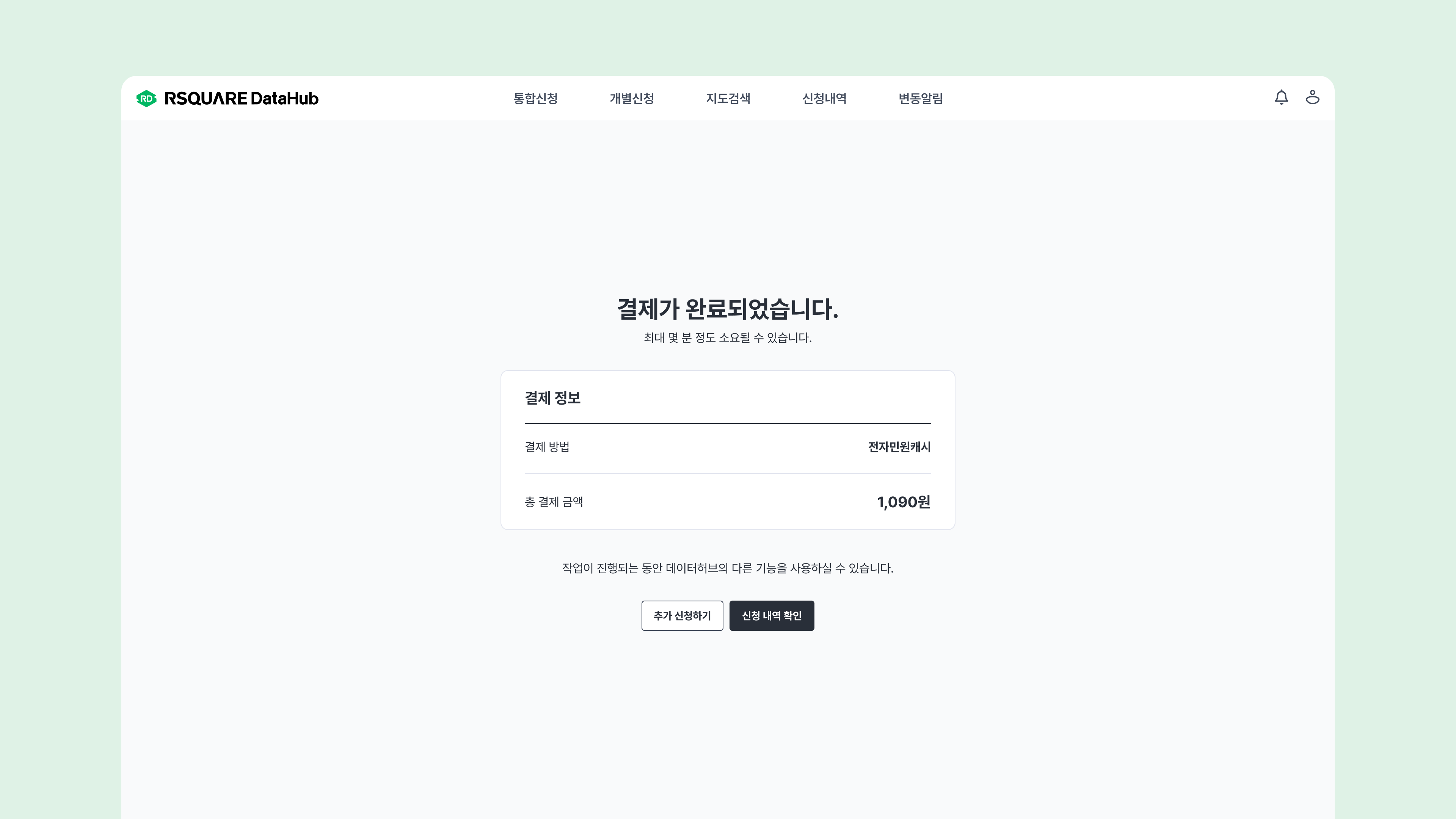 신청할 토지이용계획의 정보를 확인하고 결제 수단을 선택하여 발급 비용을 결제합니다.